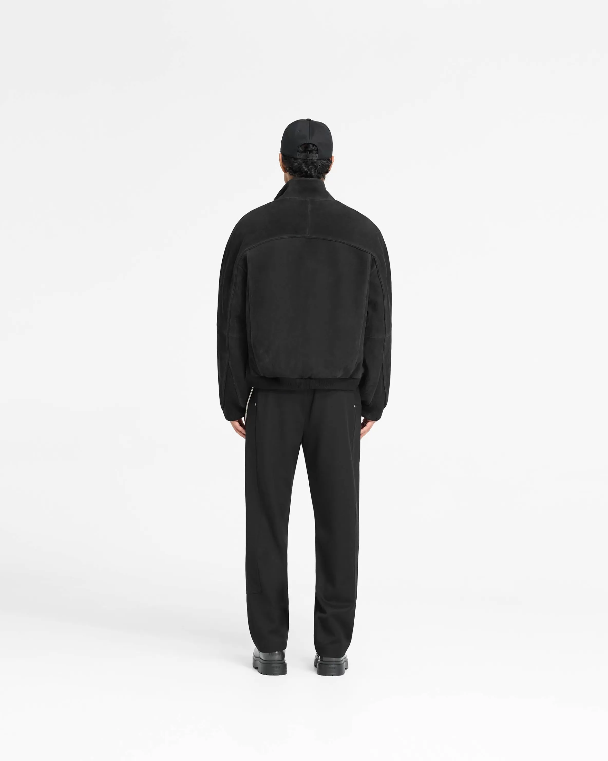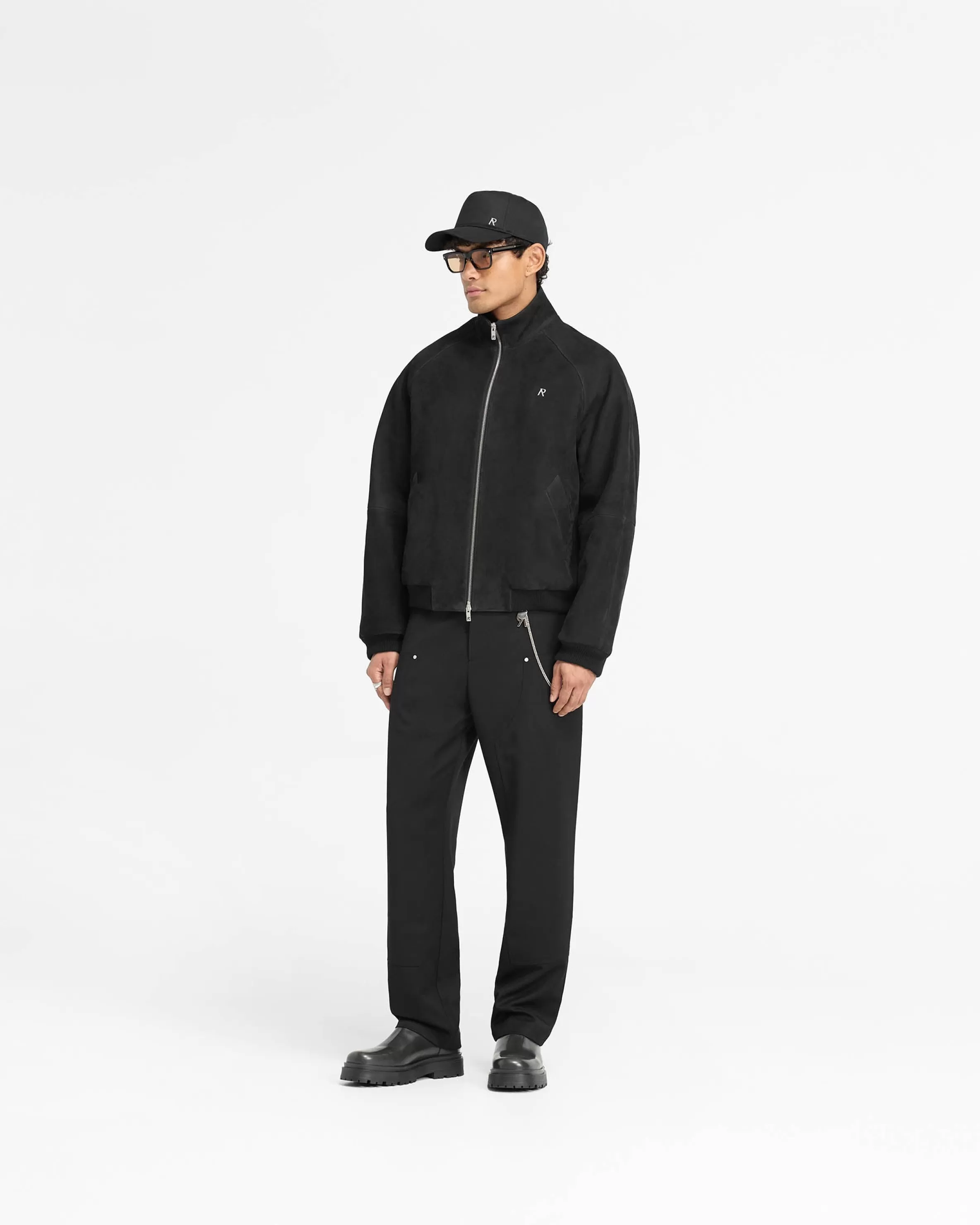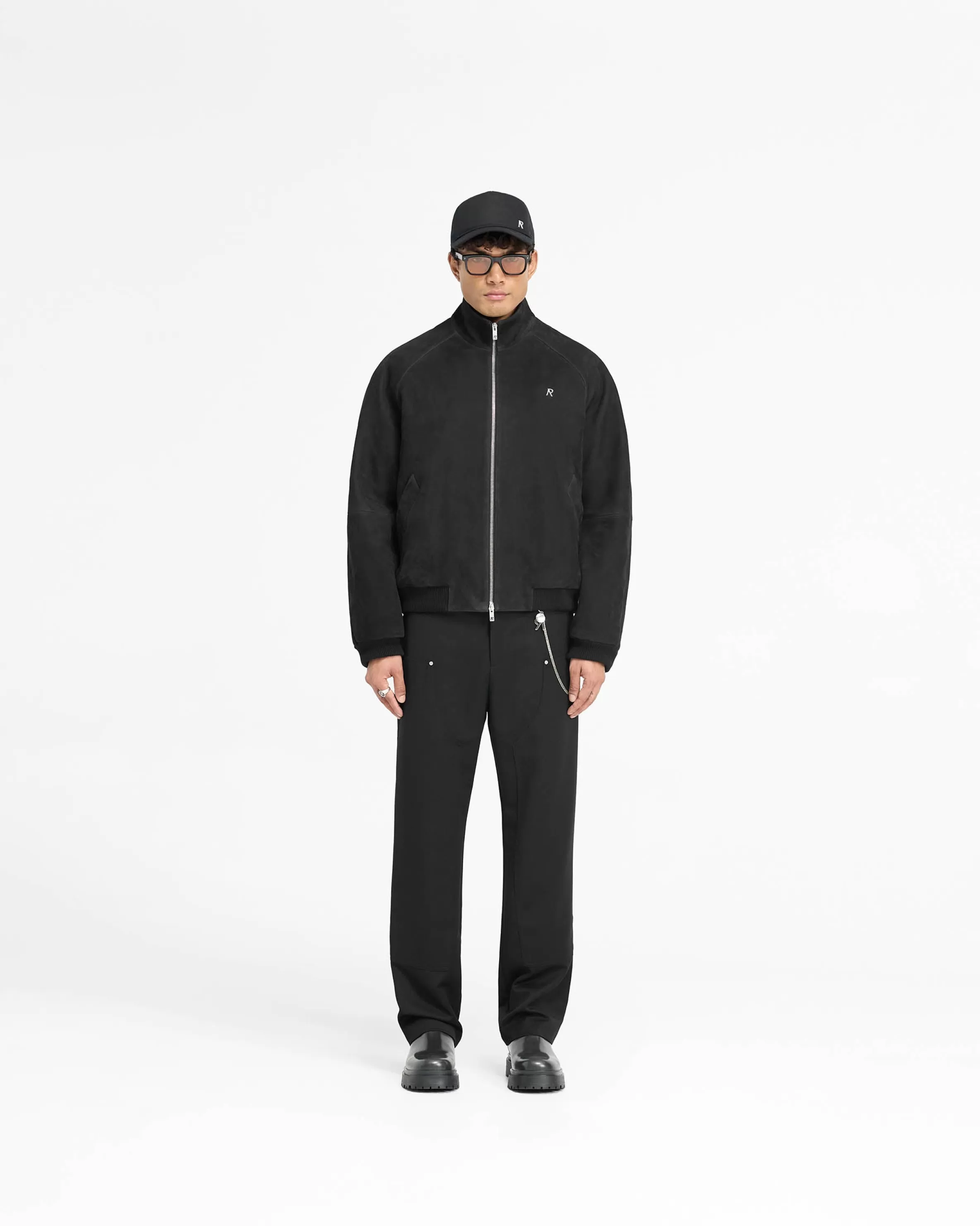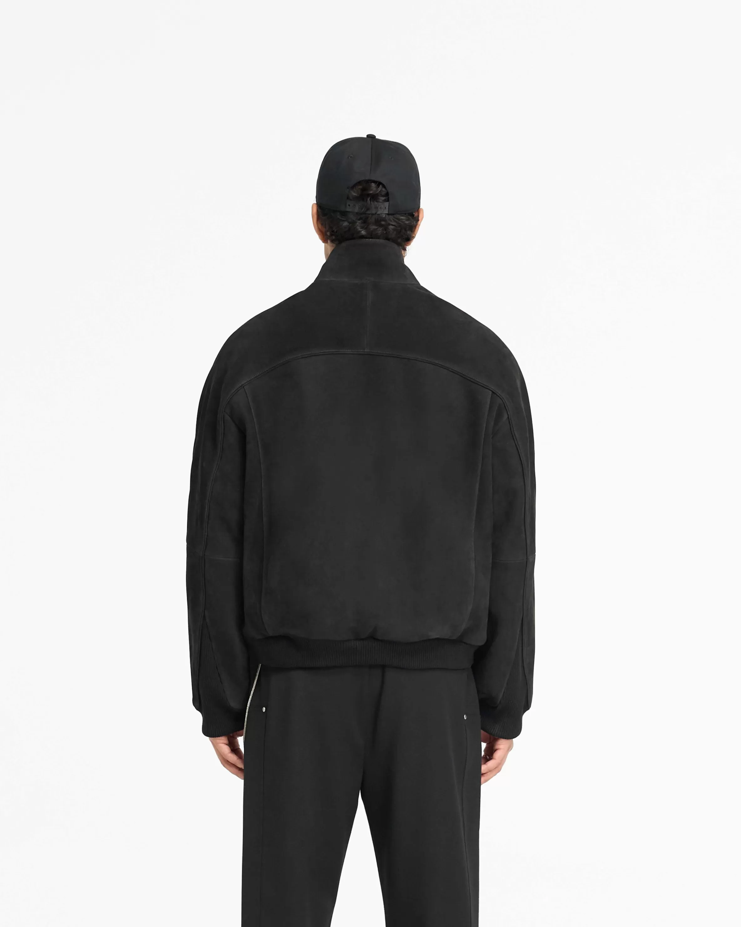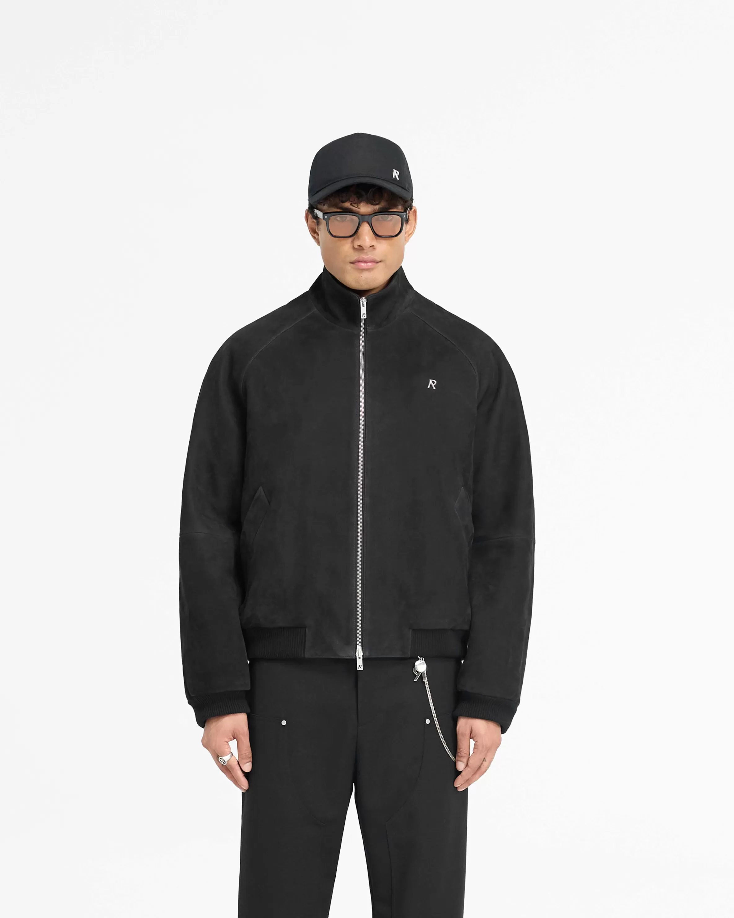 Introducing the Suede Bomber, a true collection hero piece crafted from 100% premium suede. This oversized bomber perfectly blends rugged and refined, with an air of sophistication. It has a funnel neck, finished with subtle piping to the raglan shaped sleeves and signature Represent jacquard lining. The cuffs and hem showcase a wide 2×2 rib, with a double zip closure to the front. The Bomber is finished with a metal Initial pin to the chest. Black Suede Bomber Funnel Neck Ribbed Hem u0026amp; Cuffs Metal Initial Pin Double Zip Closure Jacquard Lining Model is 188cm and 75kg wearing size MProduct