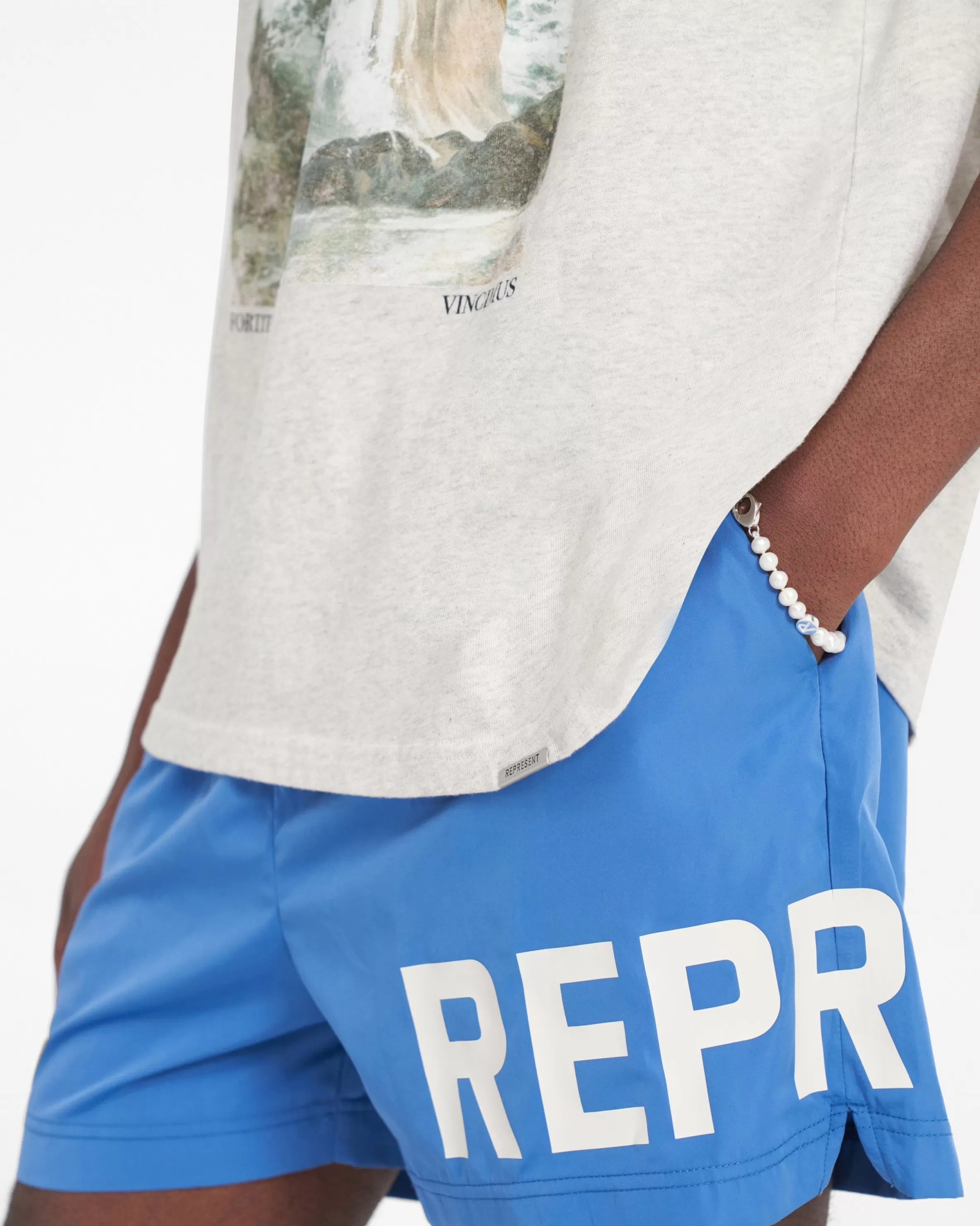 Introducing the Represent Swim Shorts in Sky Blue, featuring an elasticated waistband with tonal drawcord u0026amp; bra…