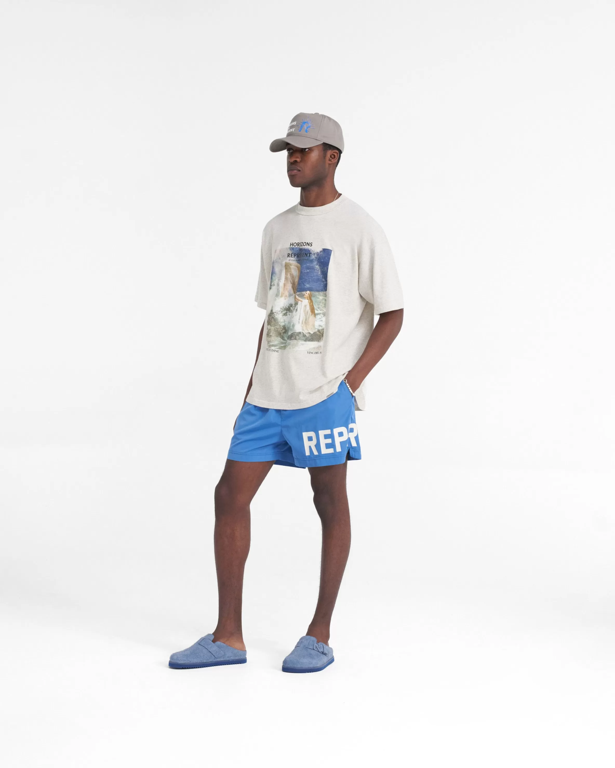 Introducing the Represent Swim Shorts in Sky Blue, featuring an elasticated waistband with tonal drawcord u0026amp; branded rubber aglets. The shorts have an inner mesh brief, hand pockets and rear patch pockets with an internal mesh key pocket. They are finished with rubberised print branding to the left leg. Sky Blue Swim Shorts Rubberised Logo Print Elasticated Waistband u0026amp; Drawcord Internal Mesh Brief Composition: 100% PolyesterCare: Machine Wash inside out at 30 degrees celsius with similar colours. Do not bleach, tumble dry, iron or dry clean. Model is 182cm and 73kg wearing size MediumProduct