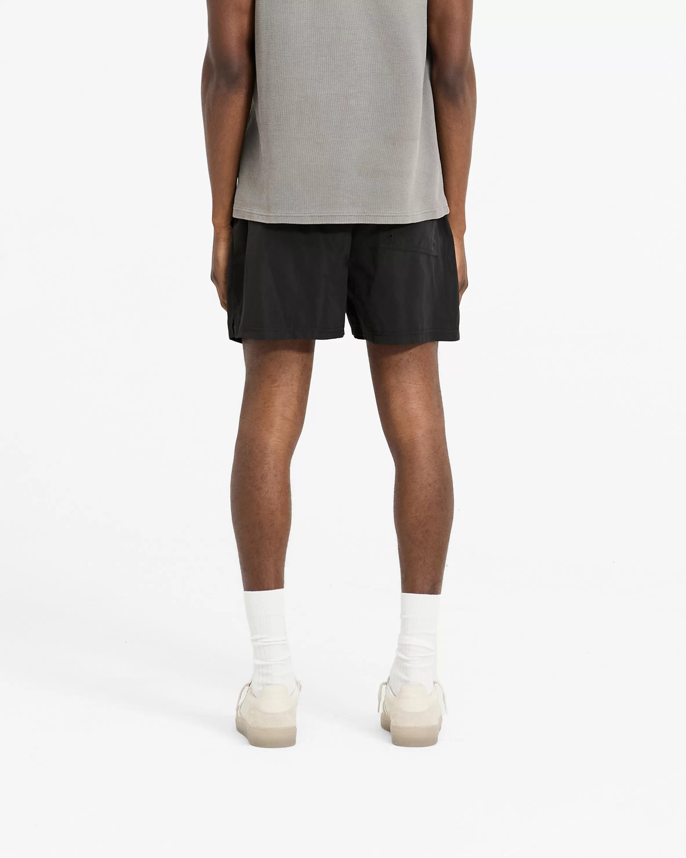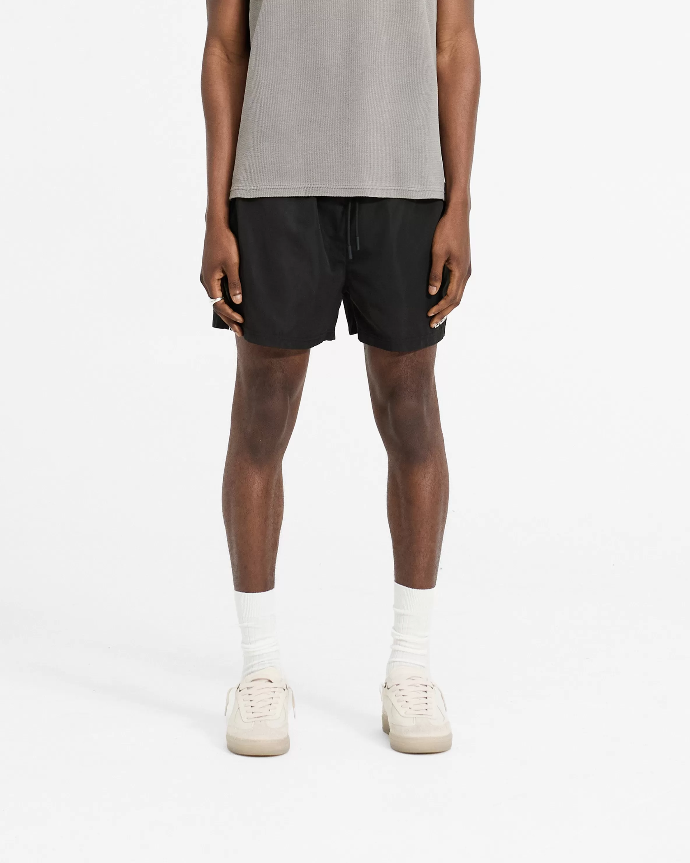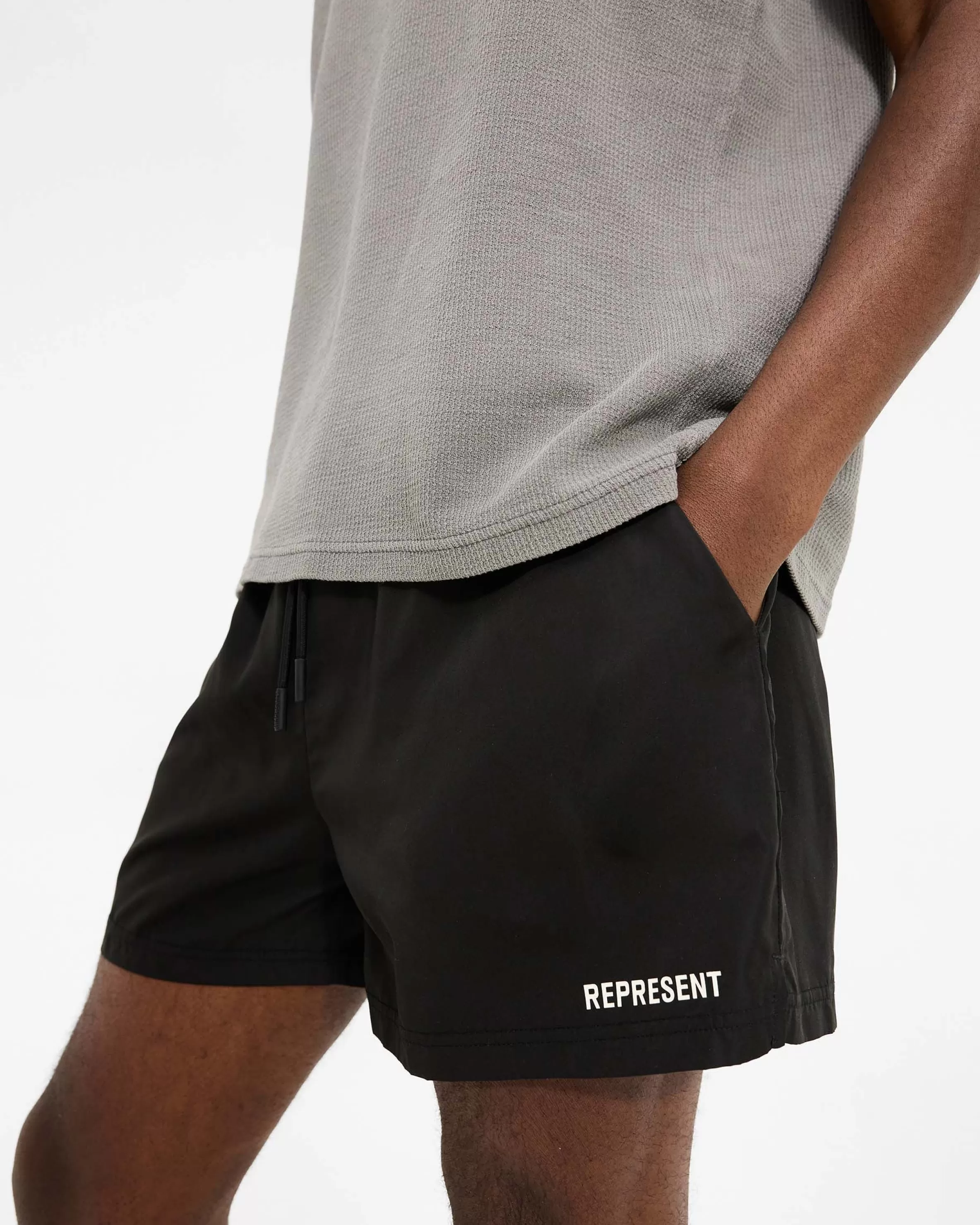 Introducing the Logo Swim Shorts in Black, a regular fit swim short style with an elasticated waistband and tonal external drawcord with branded rubber aglets. These swim shorts have our standard mesh lining, a small side split, hand pockets, small internal pocket for secure storage and a single back pocket. They feature our small vinyl Represent logo print. Black Swim Shorts Elasticated Waistband u0026amp; External Drawcord Mesh Lining Represent Vinyl Print Branding Composition: 100% Polyester. Lining: 92% Nylon, 8% Elastane Care: Machine wash inside out at 30 Degrees Celsius with similar colours. Do not bleach, tumble dry, iron or dry clean. Model is 182cm and 73kg wearing size MProduct