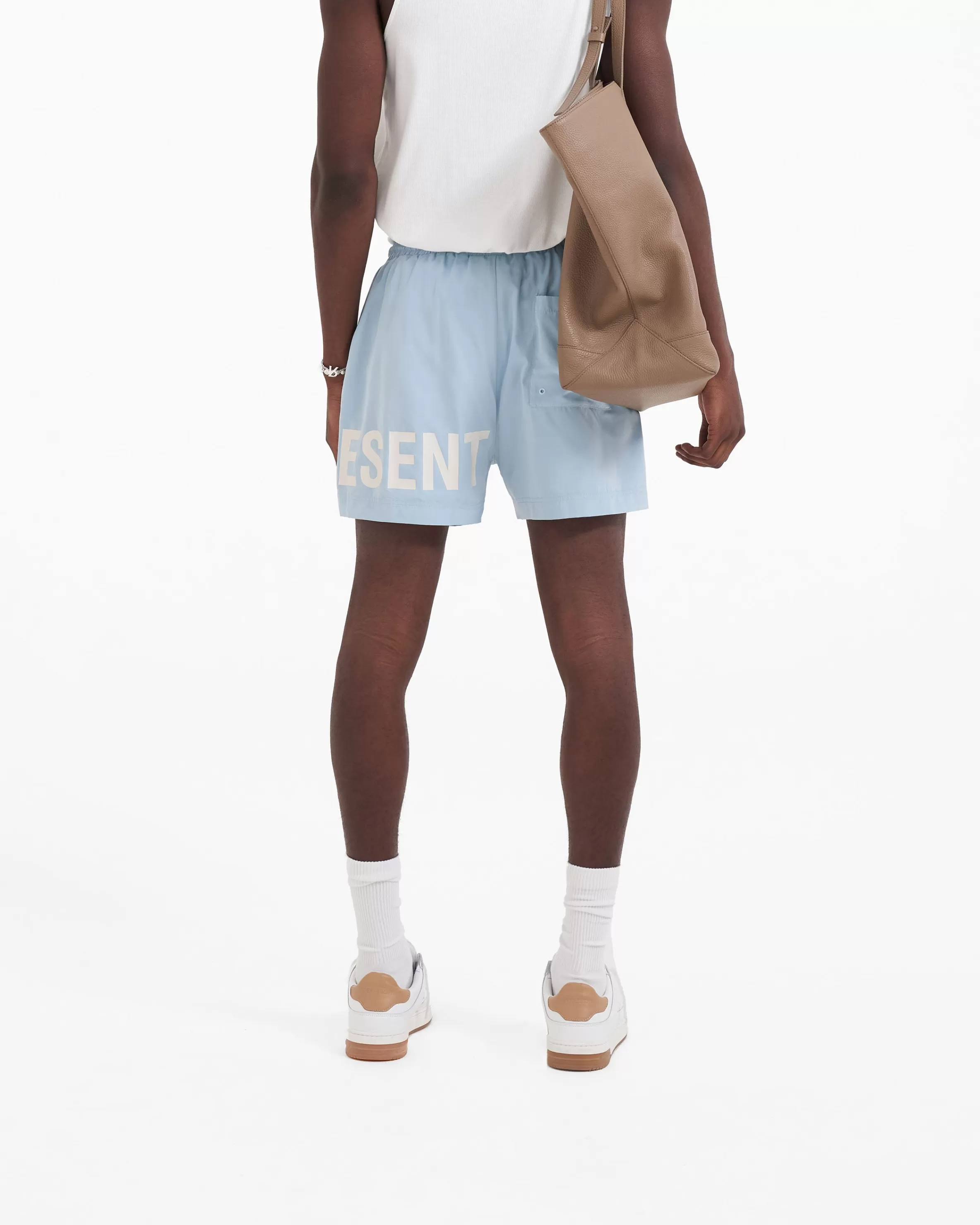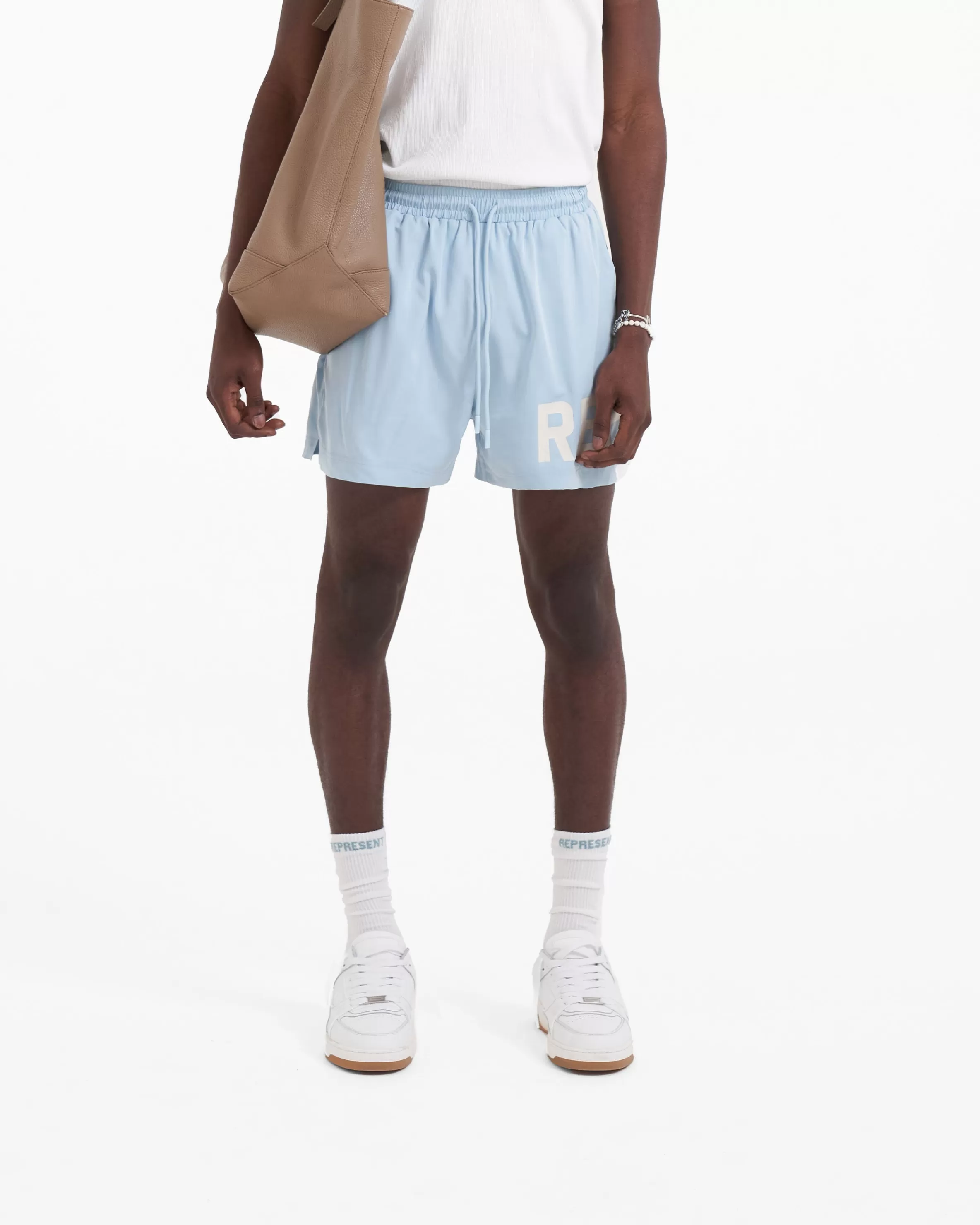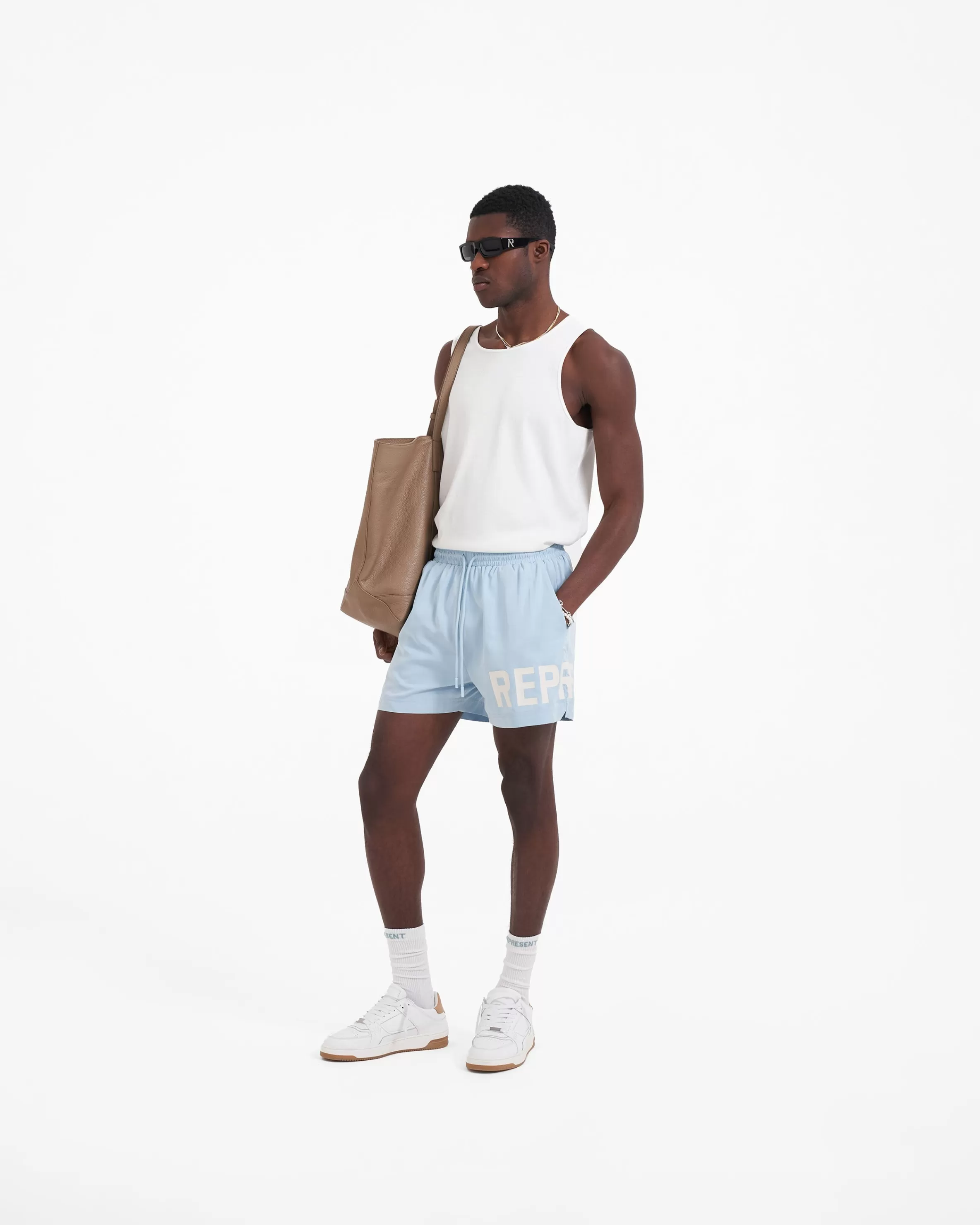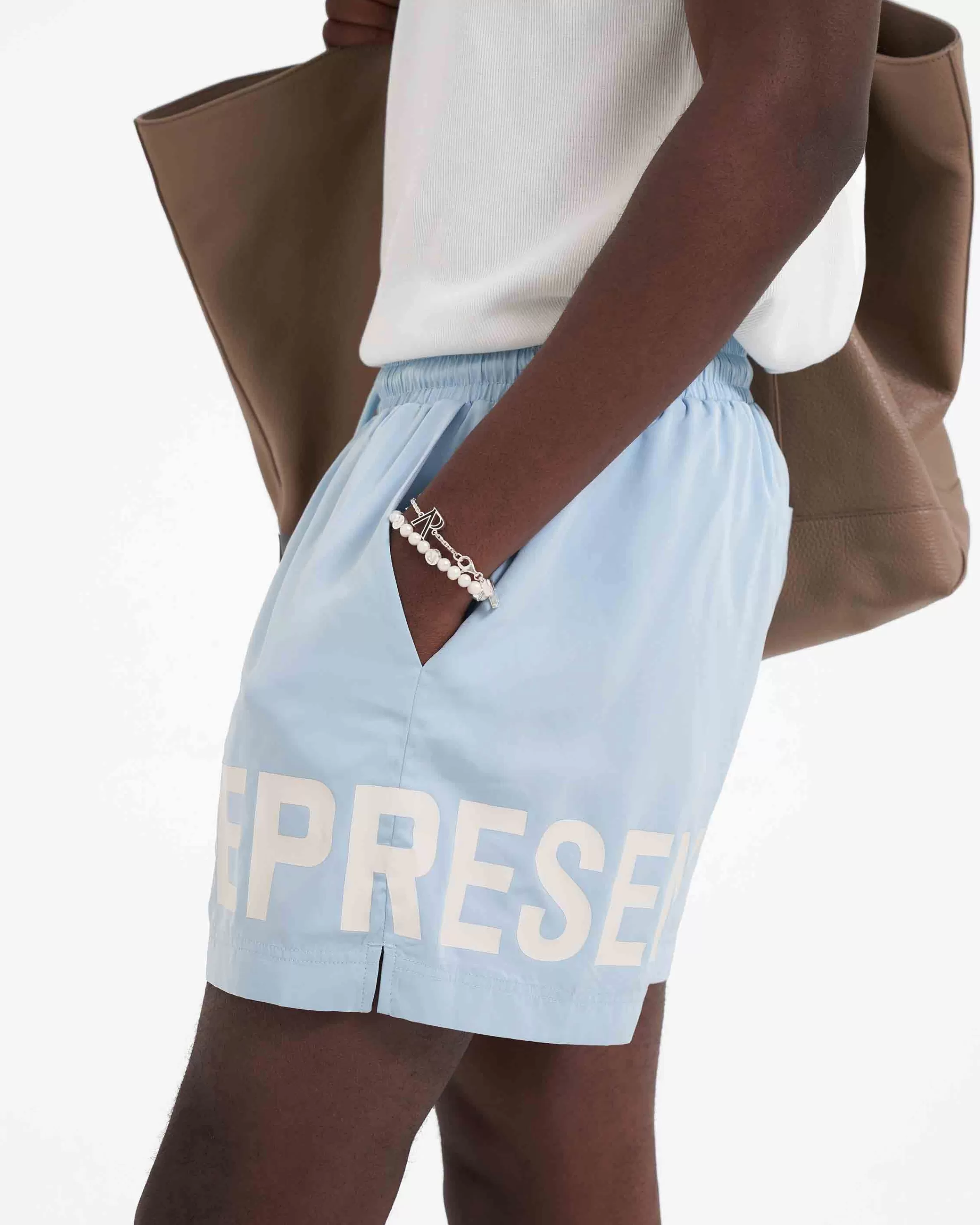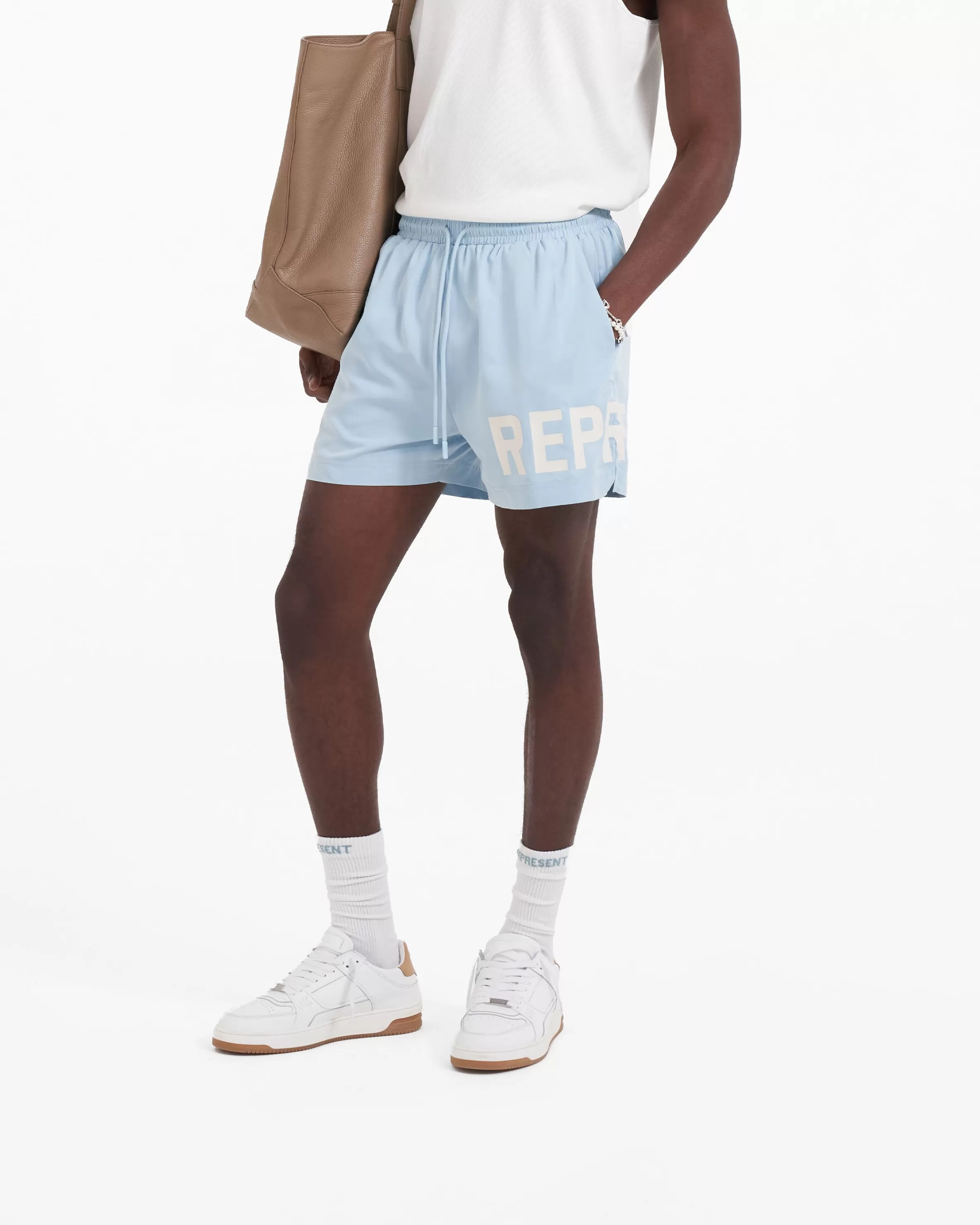 Introducing the Summer Capsule Swim Shorts in Powder Blue, featuring an elasticated waistband with drawstring and large Represent logo print across the leg. Powder Blue Swim Shorts Represent Logo Print Elasticated Waistband u0026amp; Drawstring Composition: 100% PolyesterModel is 187cm and 76kg wearing size MediumProduct