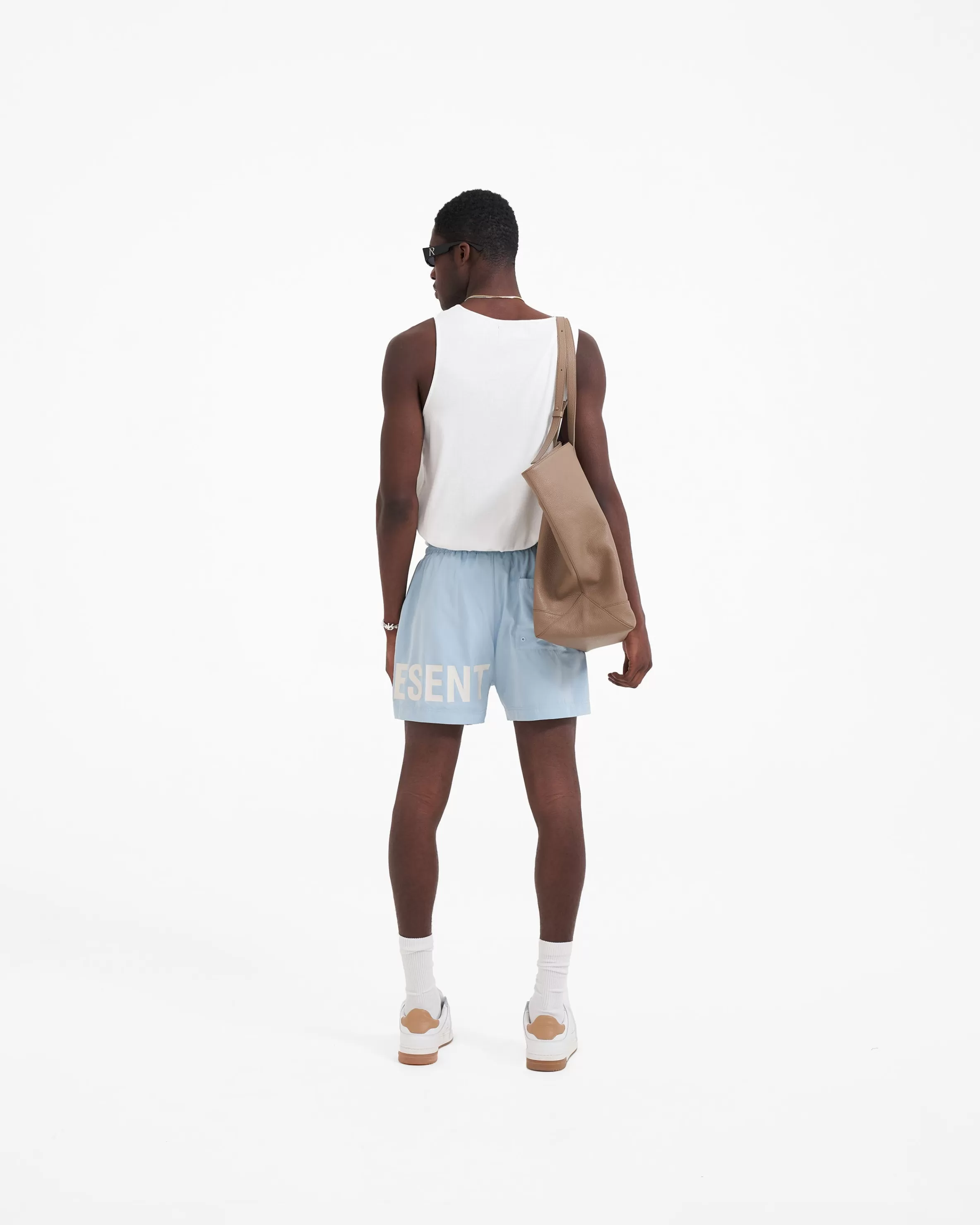 Introducing the Summer Capsule Swim Shorts in Powder Blue, featuring an elasticated waistband with drawstring and large …