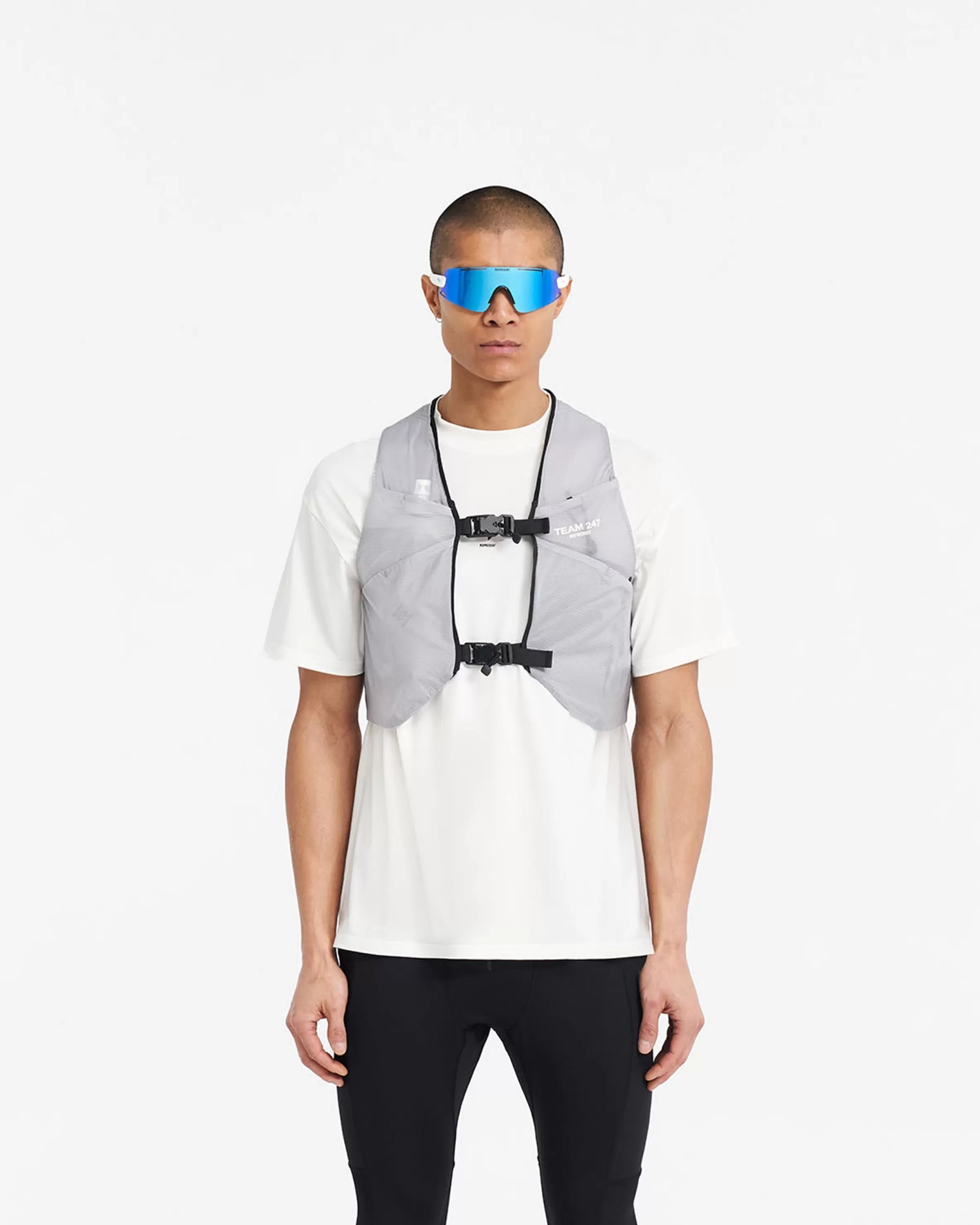 Introducing the 247 Chest Rig in Moonstone, the ultimate workout companion for every walk, run, hike or trail. The Moonstone Chest Rig is crafted from a 100% nylon ripstop fabric, a lightweight material with unparalleled durability. It has an internal spacer mesh with padding for exceptional comfort. The 247 Chest Rig features magnetic buckles to the centre front of the chest for easy (un)fastening, multiple stretch power mesh pockets for securing gels, bottles and intra-workout snacks, with bungee cords to the top pockets to secure the 2x500ml provided branded water bottles. Both bottles are equipped with a bite valve for convenience. The rig also has a small zip pocket internally to store valuables. A rear pouch is also integrated into the back of the rig to hold a hydration pack (not included). It is finished with Team 247 branding to the front, and a 247 logo with On A Mission branding to the back. We recommend the 247 Chest Rig for all extended trail or road runs. Moonstone Chest Rig Nylon Ripstop Fabric Internal Spacer Mesh Magnetic Buckles 2 Branded TPU Water Bottles Included (500ml each) Multiple Pockets – Open, Zip u0026amp; Bungee Cord Hydration Pack Pouch (Pack not Included) Composition: 100% Nylon Product