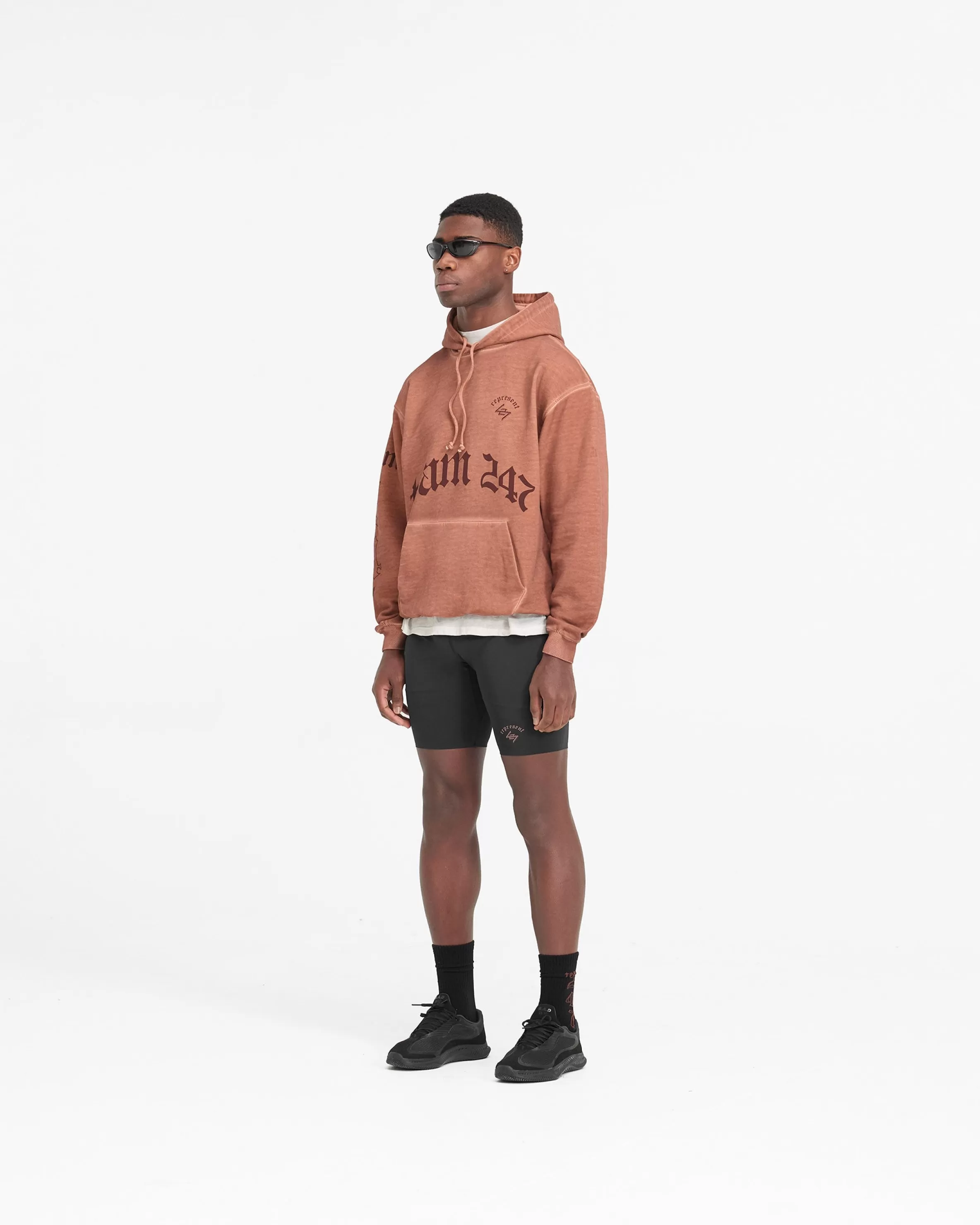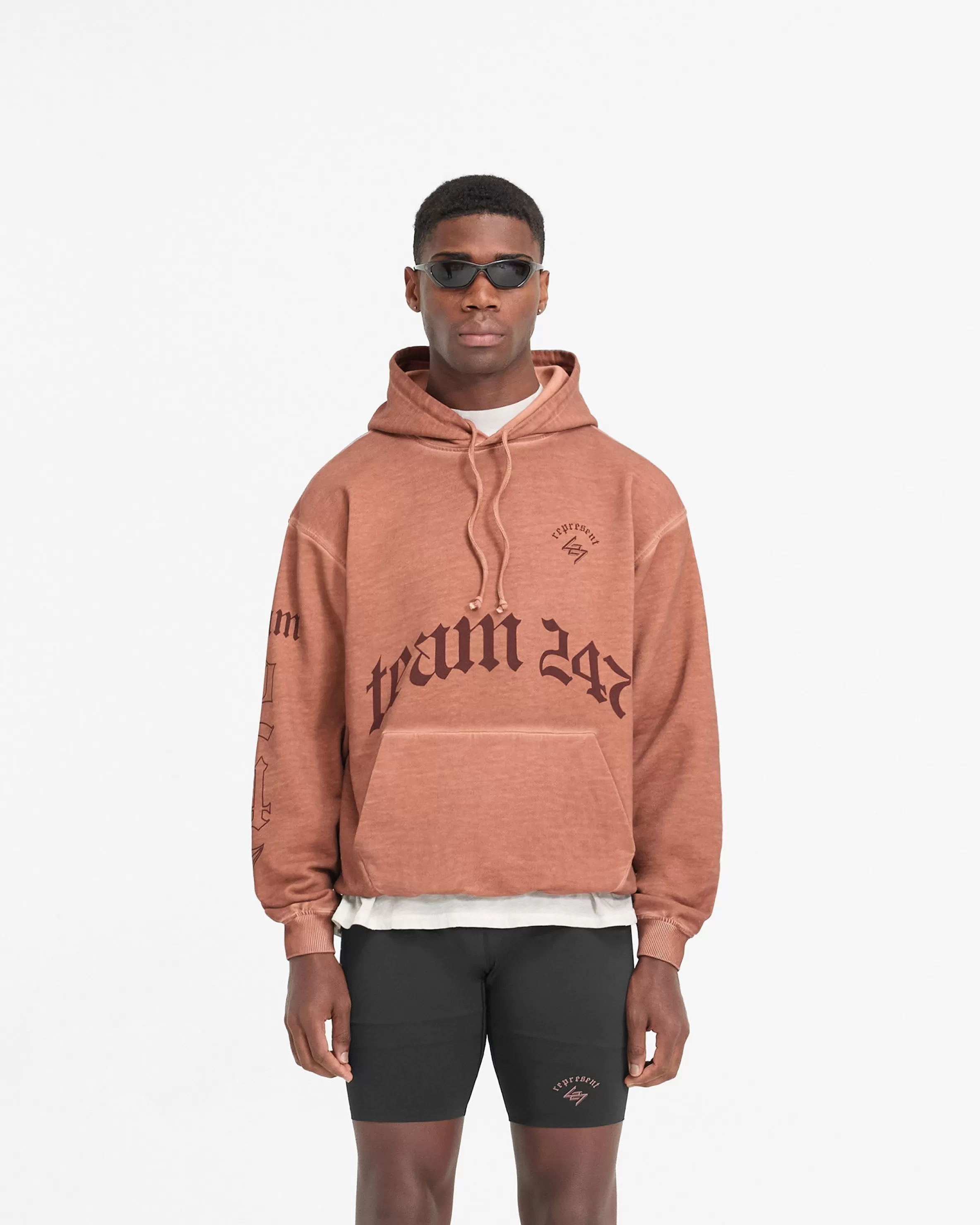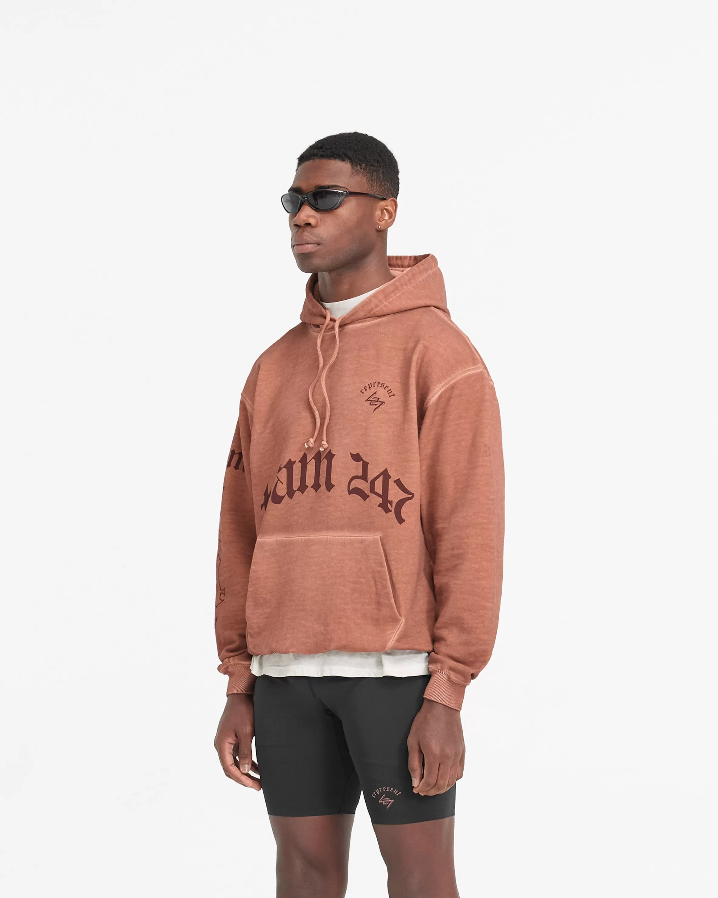 The WG247 Hoodie in Rust is built to perform. The ultimate warm up layer, it has a slightly oversized fit, with a ribbed hem and cuffs for freedom of movement without a compromise on comfort. The hoodie showcases our gothic inspired vintage 247 typography graphics; with Team 247 to the front and sleeve, 247 logo to the front, and a Spartan warrior design to the back, representing the pursuit of greatness embodied by the 247 mission. The hoodie is finished with an overdye and distressed washed effect, with a self fabric tonal internal drawcord to the hood. WG247 Hoodie Rust Slightly Oversized Fit Distressed Washed Effect Ribbed Hem u0026amp; Cuffs Vintage 247 Typography Spartan Warrior Graphic Internal Drawcord Composition: 100% Cotton400gsm Note: Due to the manual washing process of this garment, there will be slight discrepancies in hue and wash between pieces. Model is 190cm and 77kg wearing size MProduct