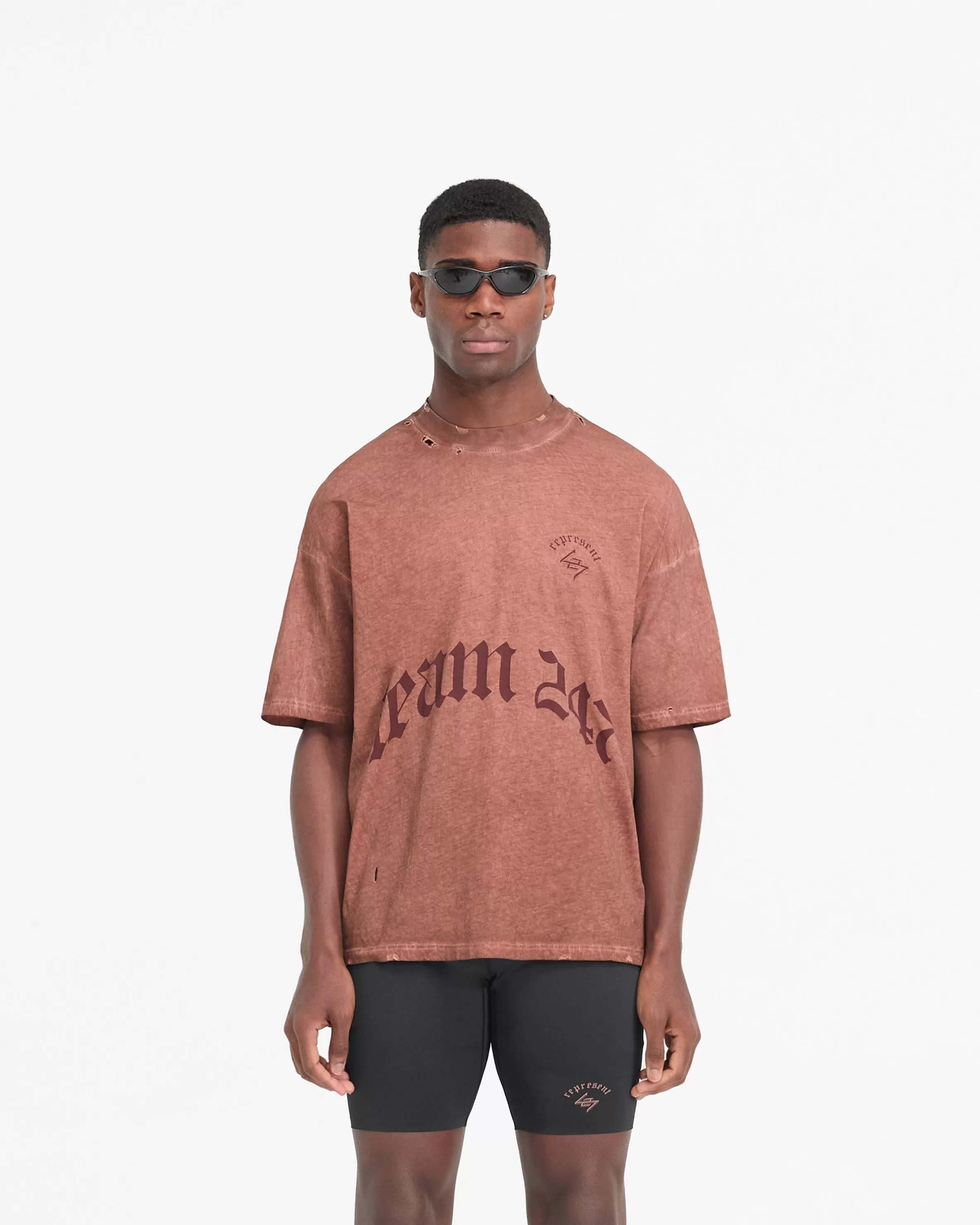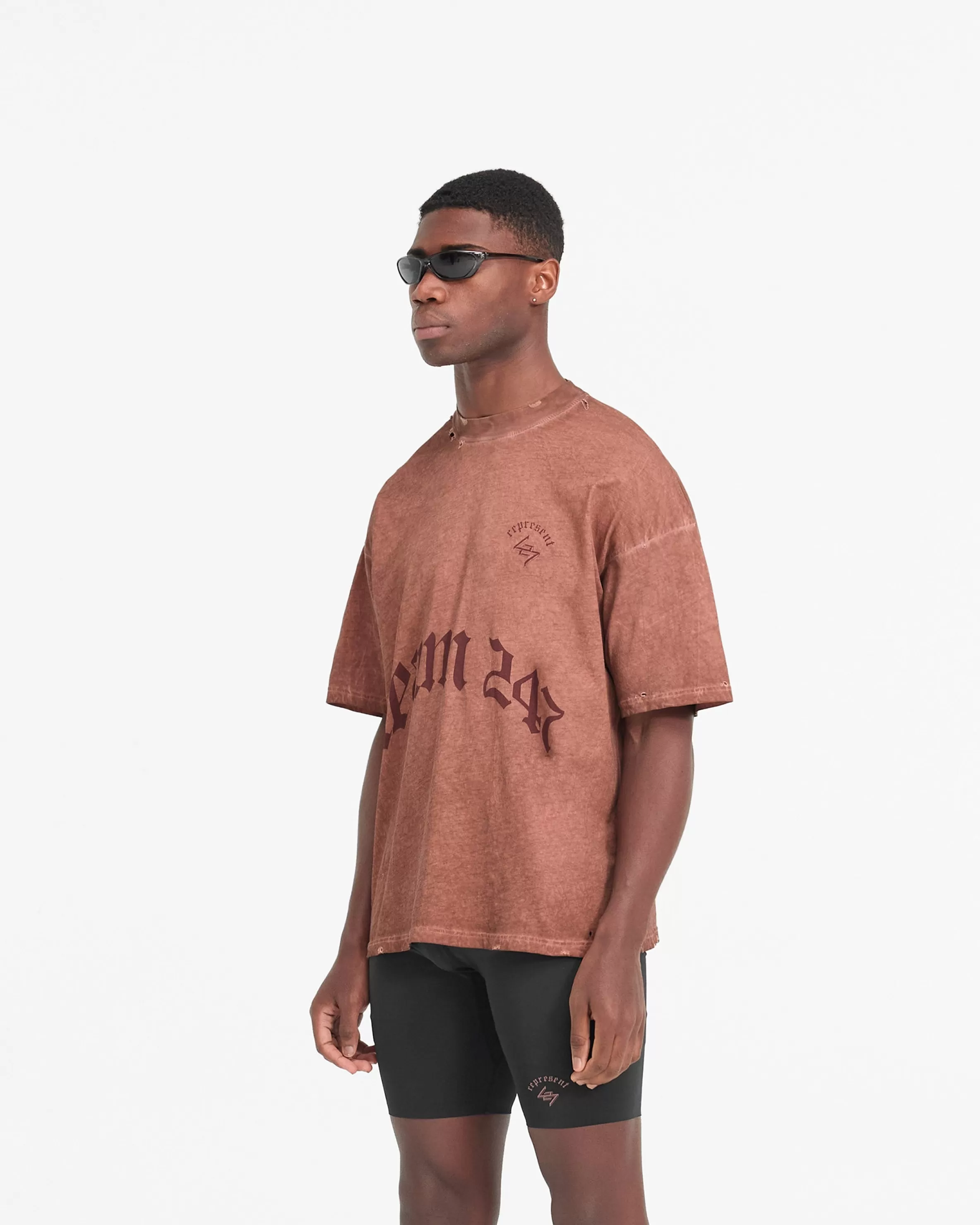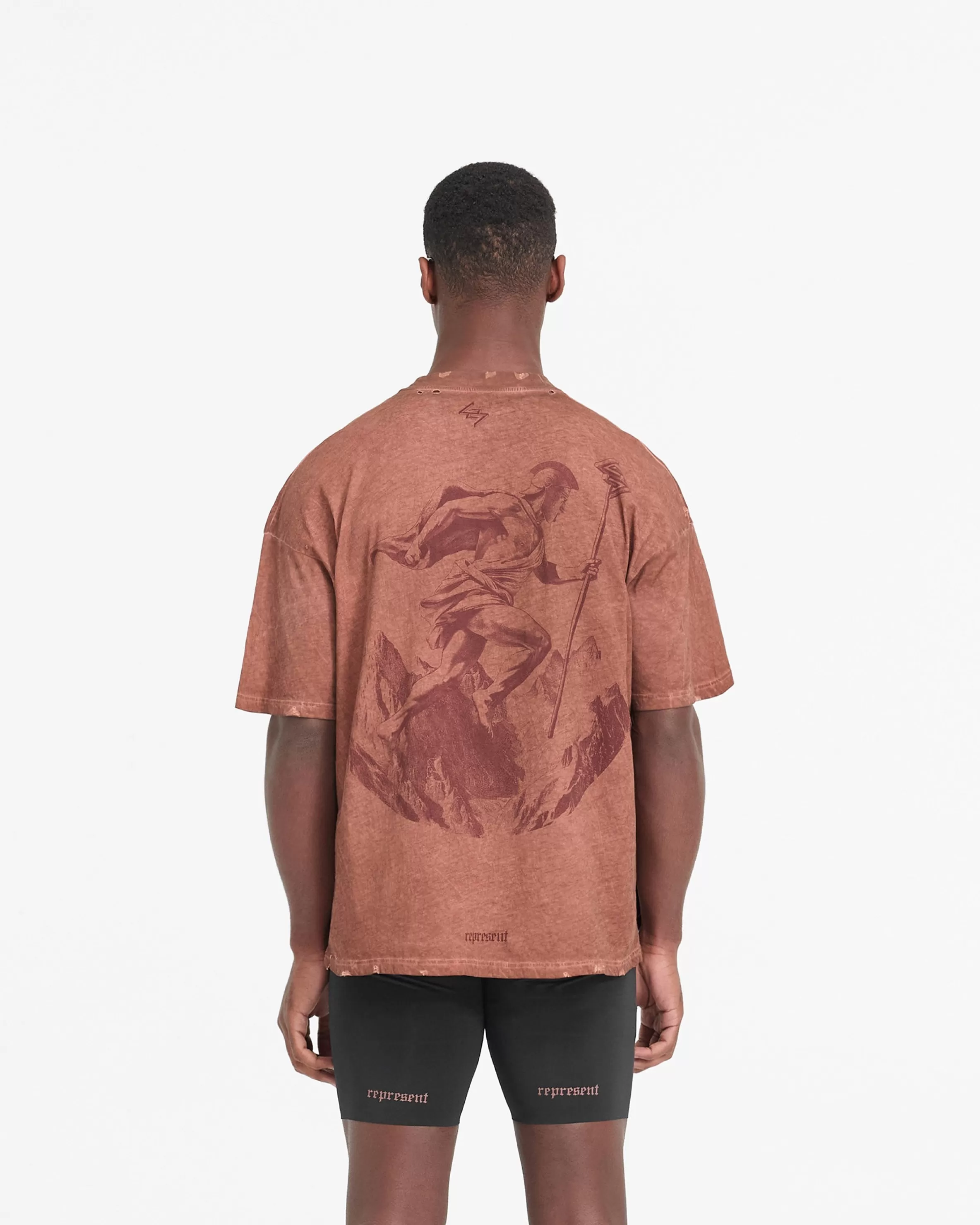 The WG247 T-Shirt in Rust is built to perform, with a meticulously detailed vintage aesthetic. The t-shirt is crafted from a lighter weight natural jersey cotton which allows air to circulate, affording a high degree of breathability and thermoregulatory properties, with a slightly oversized fit. It has a vintage wash to the fabric, and our gothic inspired typography graphics; with Team 247 and 247 logo to the front, Represent to the back hem, and a Spartan warrior design to the back, representing the pursuit of greatness embodied by the 247 mission. The t-shirt is finished with distressing details to the collar, hem, shoulders and under arm. WG247 T-Shirt Slightly Oversized Washed Rust Vintage 247 Typography Spartan Graphic Heavy Distressed Details Breathable u0026amp; Lightweight Composition: 100% Cotton Note: Due to the manual washing process of this garment, there will be slight discrepancies in hue and wash between pieces. Model is 190cm and 77kg wearing size MProduct