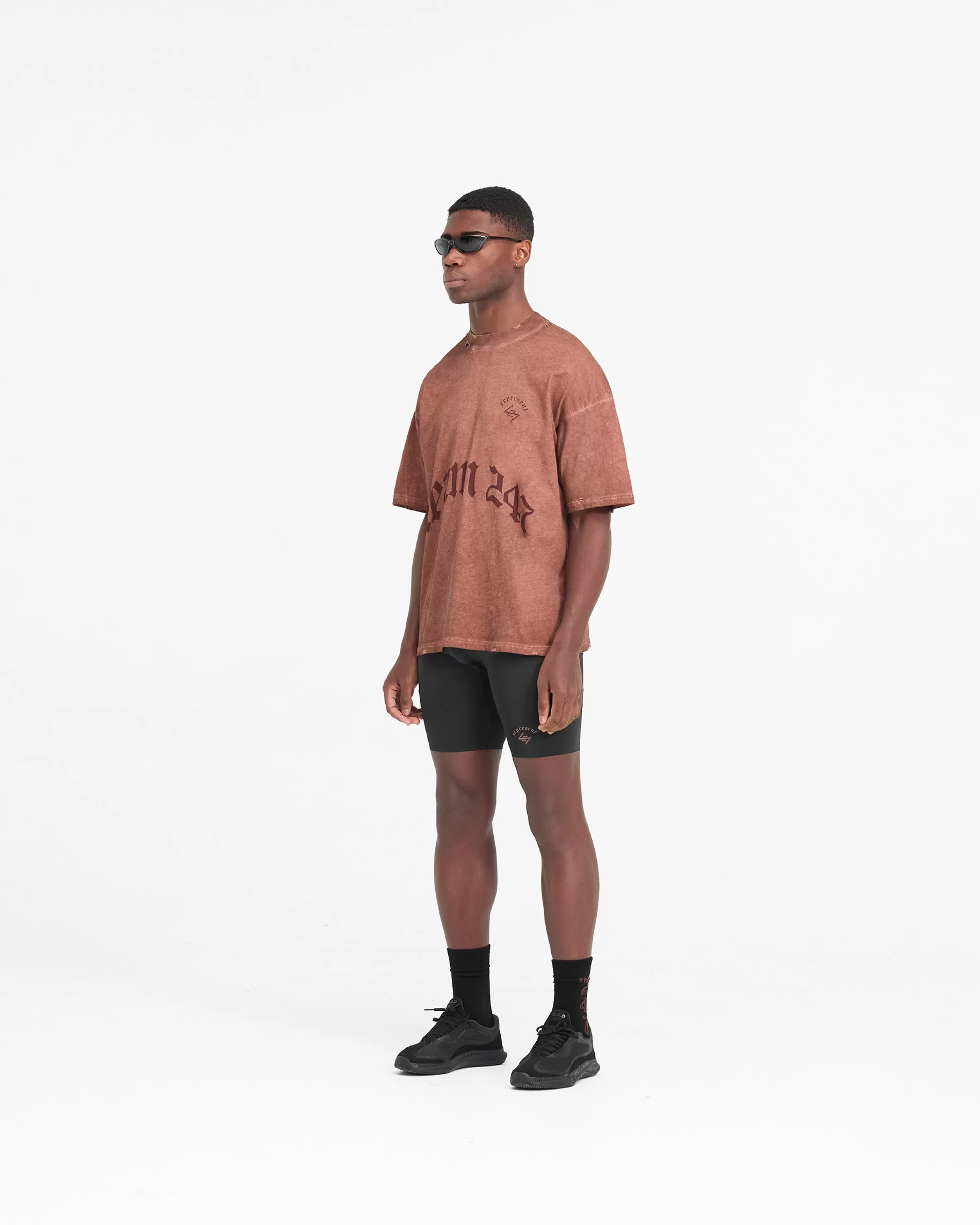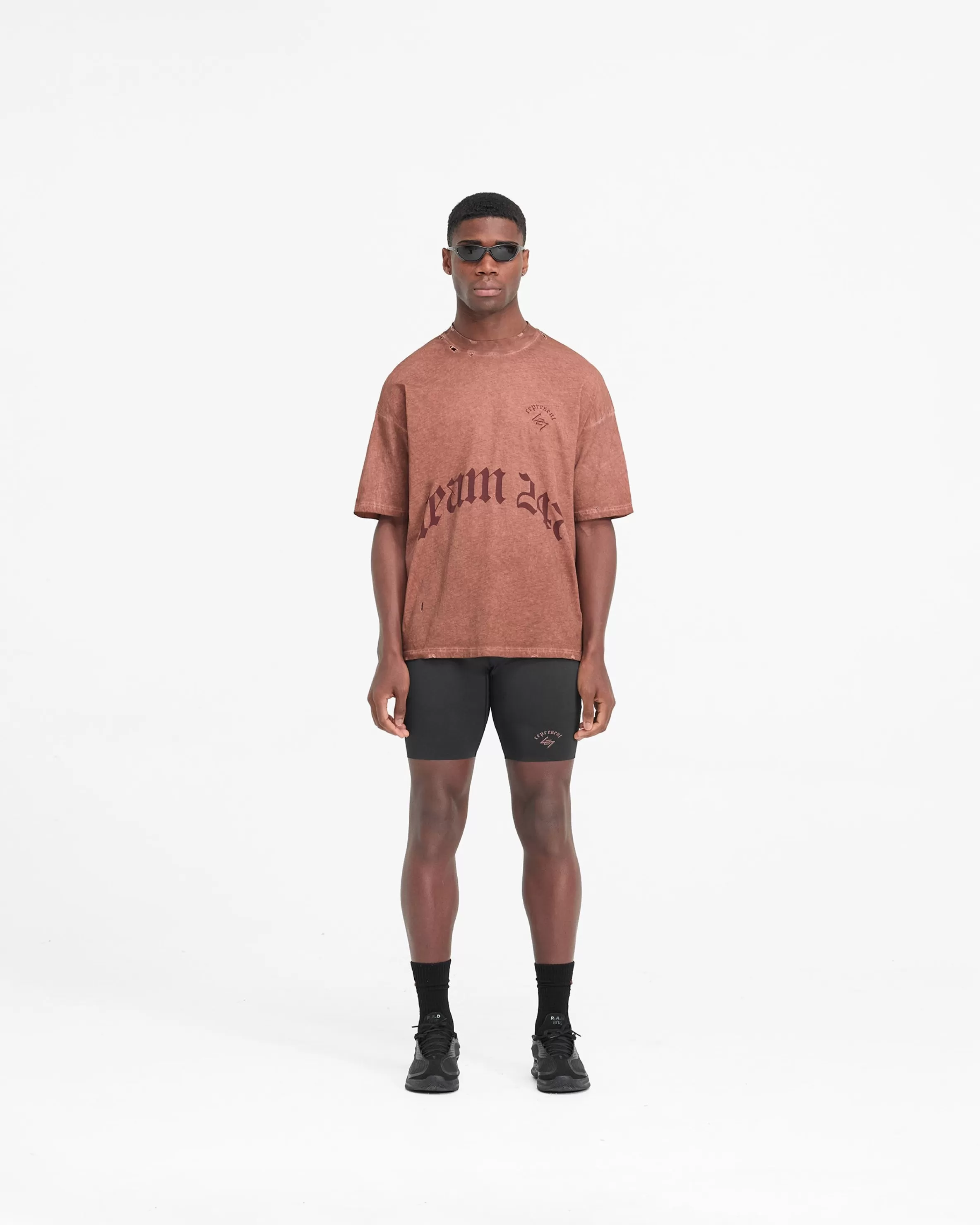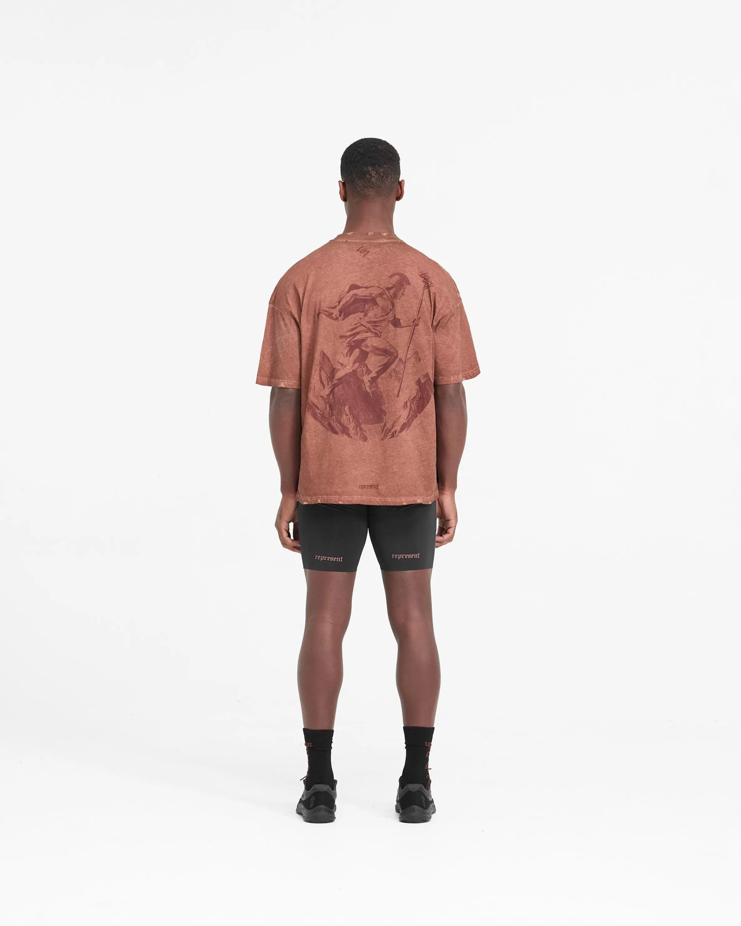 The WG247 T-Shirt in Rust is built to perform, with a meticulously detailed vintage aesthetic. The t-shirt is crafted from a lighter weight natural jersey cotton which allows air to circulate, affording a high degree of breathability and thermoregulatory properties, with a slightly oversized fit. It has a vintage wash to the fabric, and our gothic inspired typography graphics; with Team 247 and 247 logo to the front, Represent to the back hem, and a Spartan warrior design to the back, representing the pursuit of greatness embodied by the 247 mission. The t-shirt is finished with distressing details to the collar, hem, shoulders and under arm. WG247 T-Shirt Slightly Oversized Washed Rust Vintage 247 Typography Spartan Graphic Heavy Distressed Details Breathable u0026amp; Lightweight Composition: 100% Cotton Note: Due to the manual washing process of this garment, there will be slight discrepancies in hue and wash between pieces. Model is 190cm and 77kg wearing size MProduct