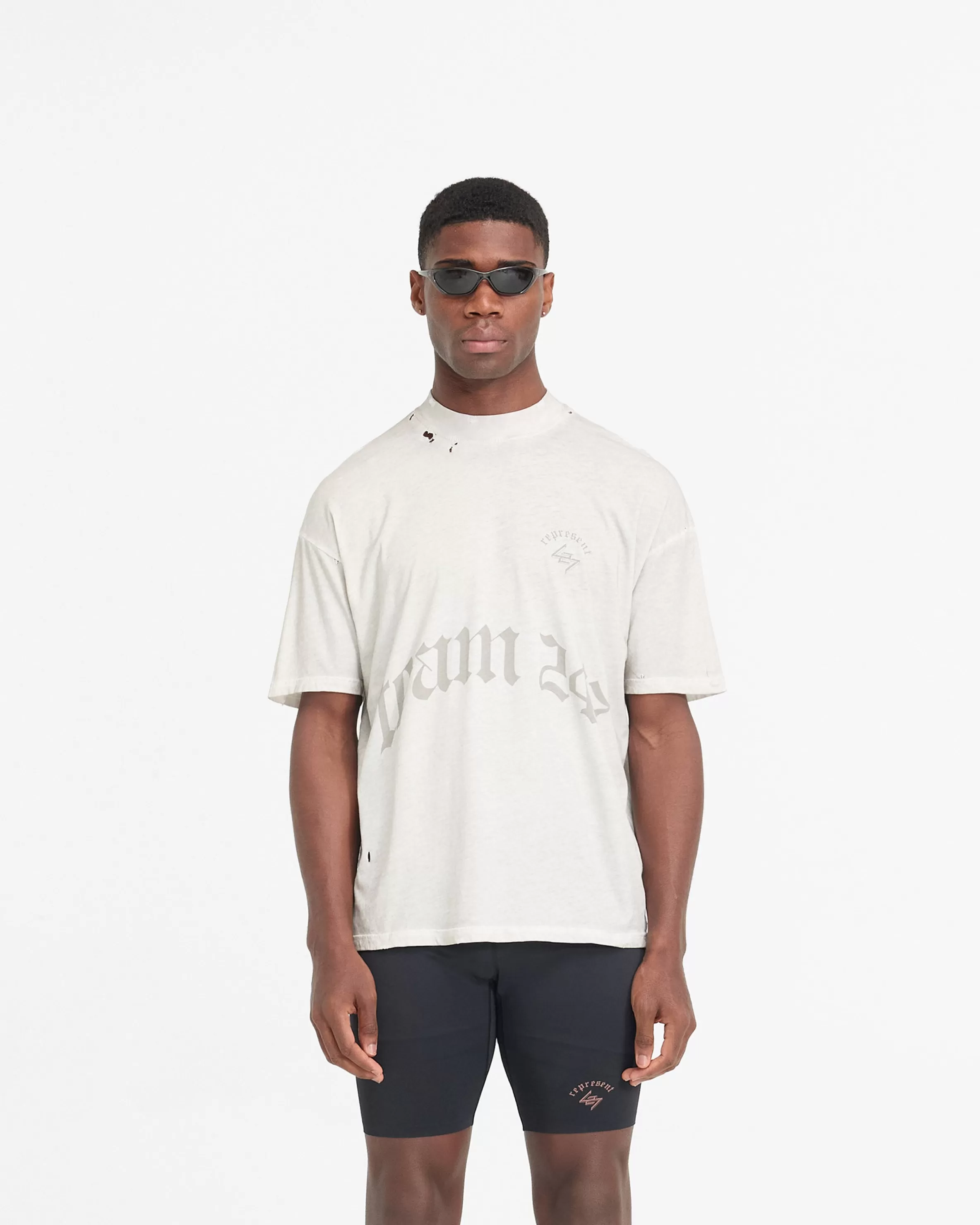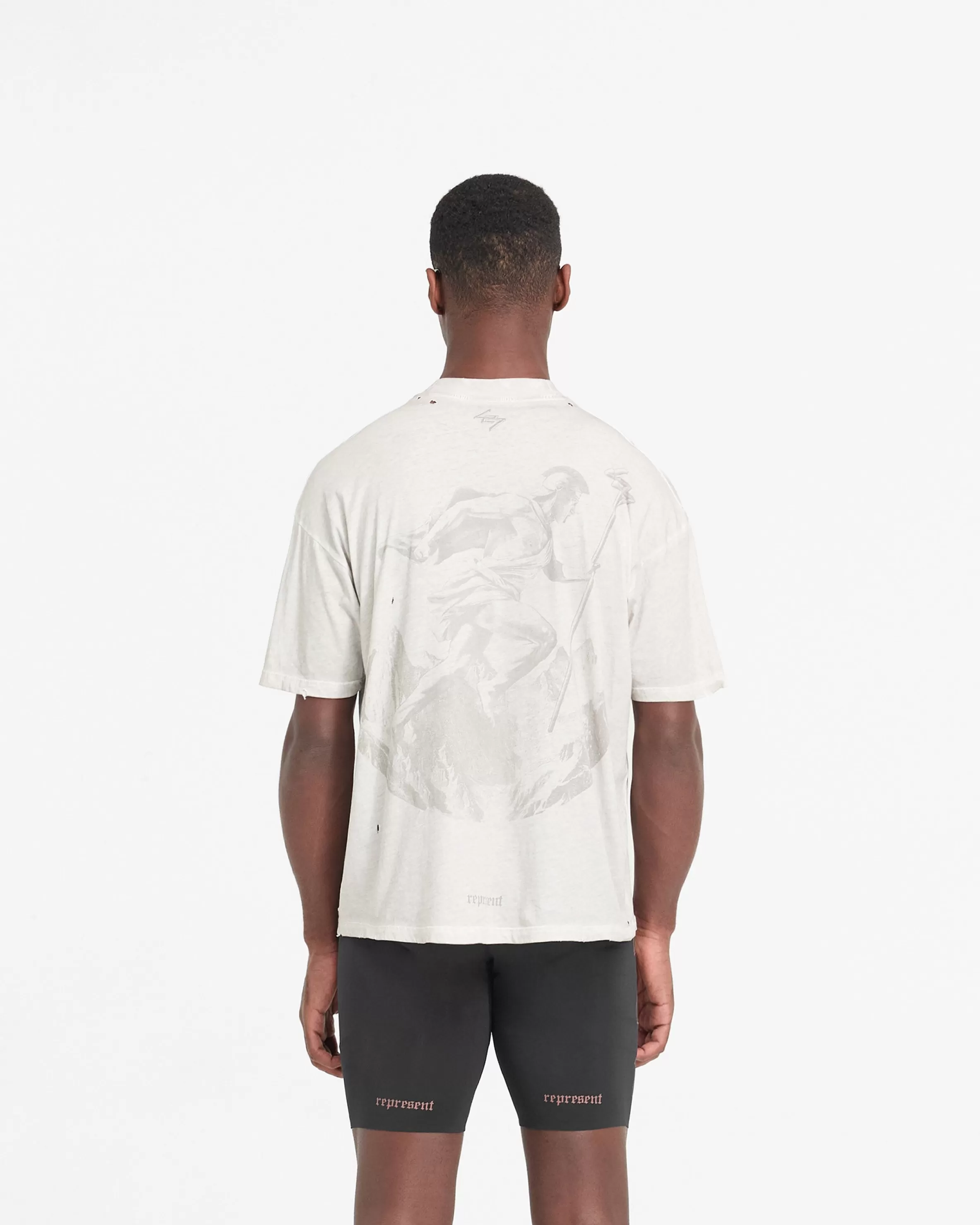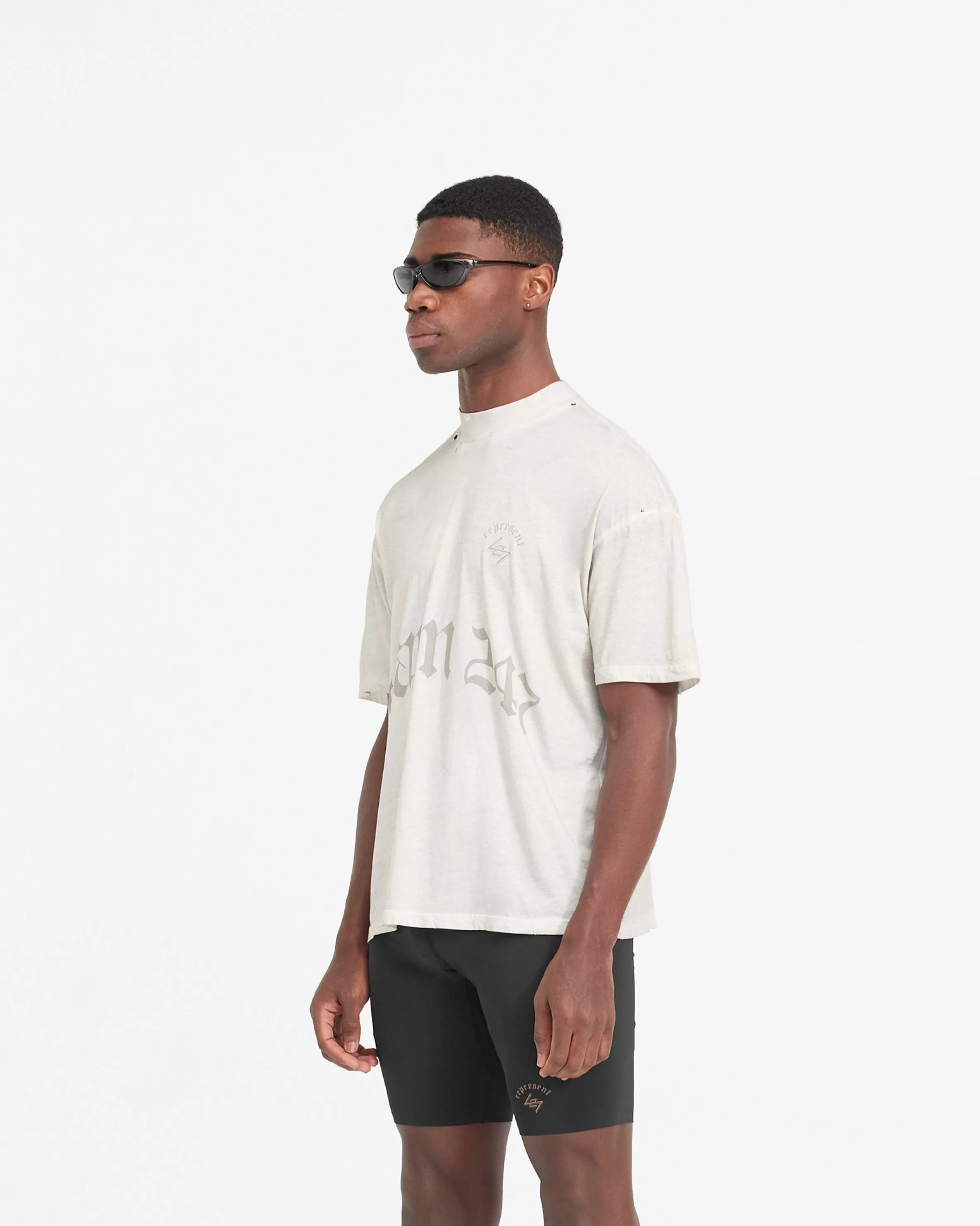The WG247 T-Shirt in Washed Bleach is built to perform, with a meticulously detailed vintage aesthetic. The t-shirt is crafted from a lighter weight natural jersey cotton which allows air to circulate, affording a high degree of breathability and thermoregulatory properties, with a slightly oversized fit. It has a vintage wash to the fabric, and our gothic inspired typography graphics; with Team 247 and 247 logo to the front, Represent to the back hem, and a Spartan warrior design to the back, representing the pursuit of greatness embodied by the 247 mission. The t-shirt is finished with distressing details to the collar, hem, shoulders and under arm. WG247 T-Shirt Slightly Oversized Washed Bleach Vintage 247 Typography Spartan Graphic Heavy Distressed Details Breathable u0026amp; Lightweight Composition: 100% Cotton Note: Due to the manual washing process of this garment, there will be slight discrepancies in hue and wash between pieces. Model is 190cm and 77kg wearing size MProduct