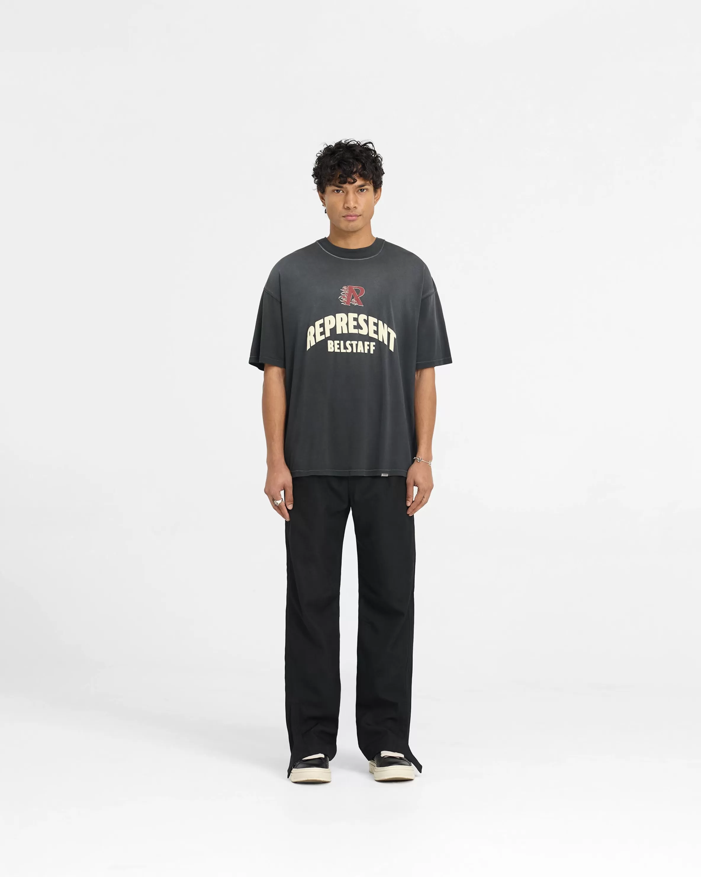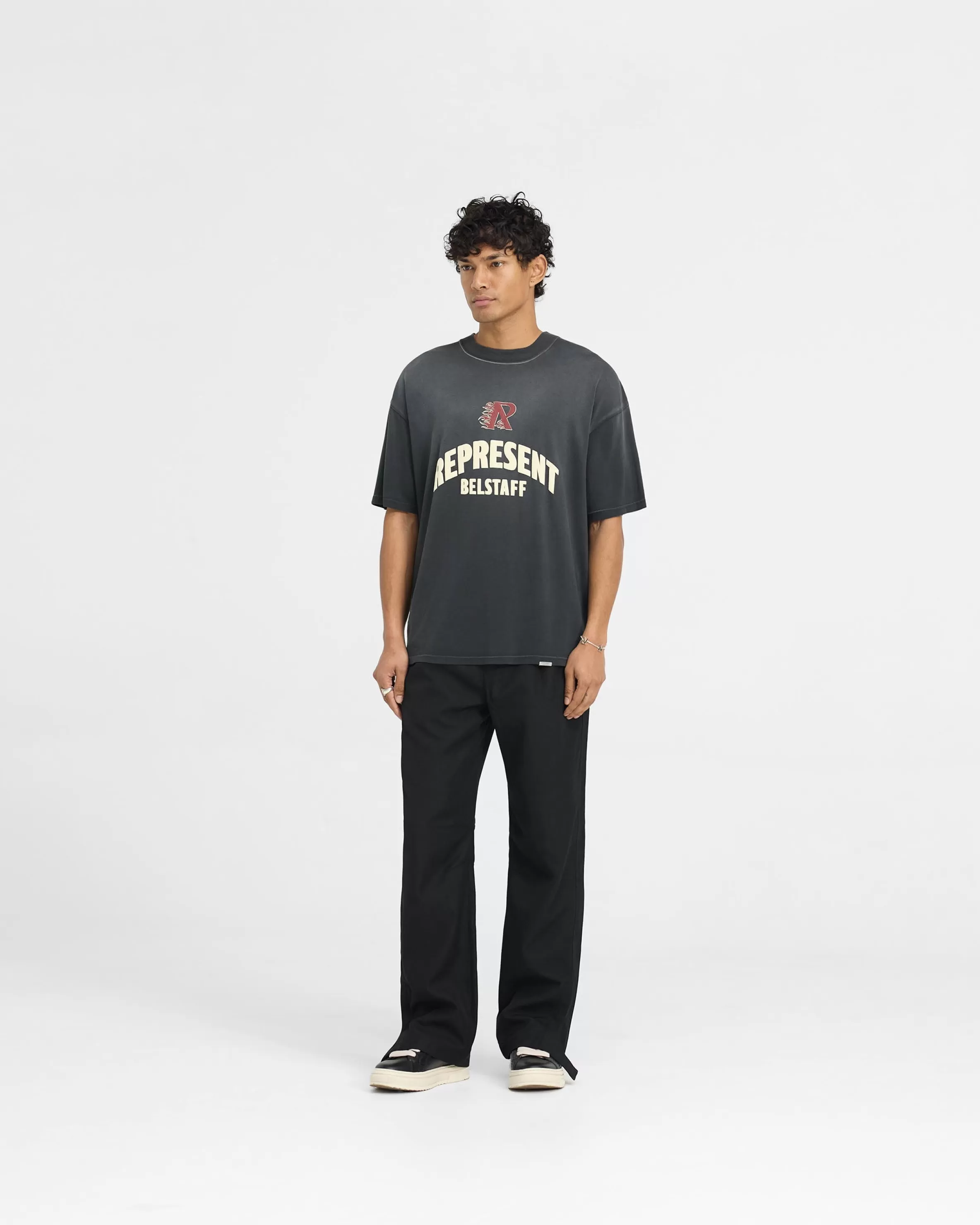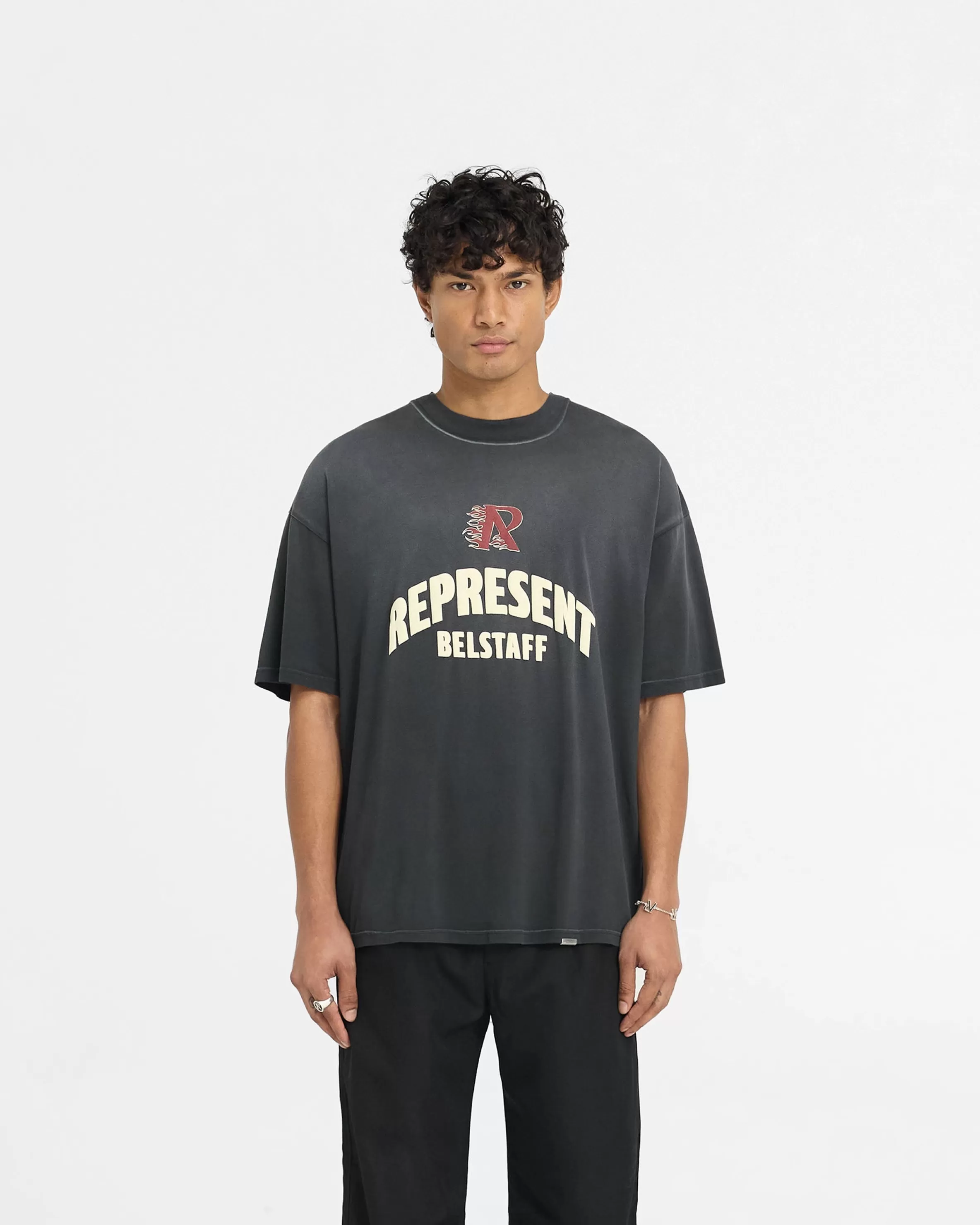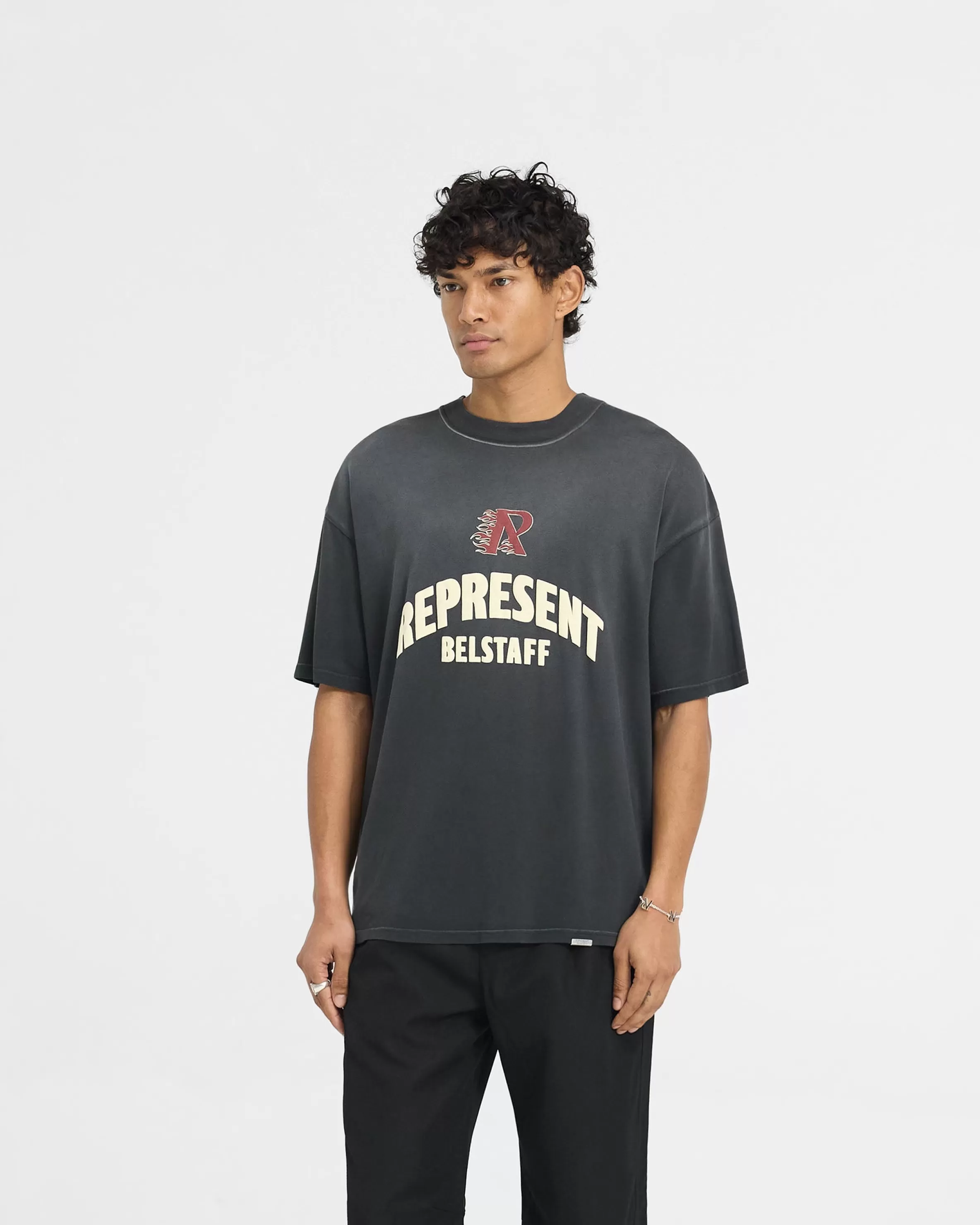 Introducing the Represent x Belstaff Flame Phoenix T-Shirt in Shadow, a luxury oversized and medium weight t-shirt, built to stand the test of time. The t-shirt is in a stained black wash colourway to bring to the fore a well worn, road-aged aesthetic. It showcases a flamed Initial to the front, and a textured print, contemporarily styled iteration of Belstaff’s Phoenix logo which the brand debuted in 1969 to the back. It is finished with the signature Represent metal bar logo to the hem. Represent x Belstaff Flame Phoenix Hoodie Shadow (Stained Black Wash) Oversized Medium Weight Stylised Initial u0026amp; Phoenix Logos Represent Metal Bar Composition: 100% Cotton Product Care: Mild Machine Wash at 30 Degrees Celsius. Do not bleach, tumble dry or dry clean. Line Dry in the shade and cool iron on reverse. Wash inside out with similar colours, and remove promptly. Do not dry in direct sunlight. Do not iron on print. Do not rub isolated stains. Due to the nature of the dye, this will naturally fade with cleaning and water. Model is 188cm and 75kg wearing size MProduct