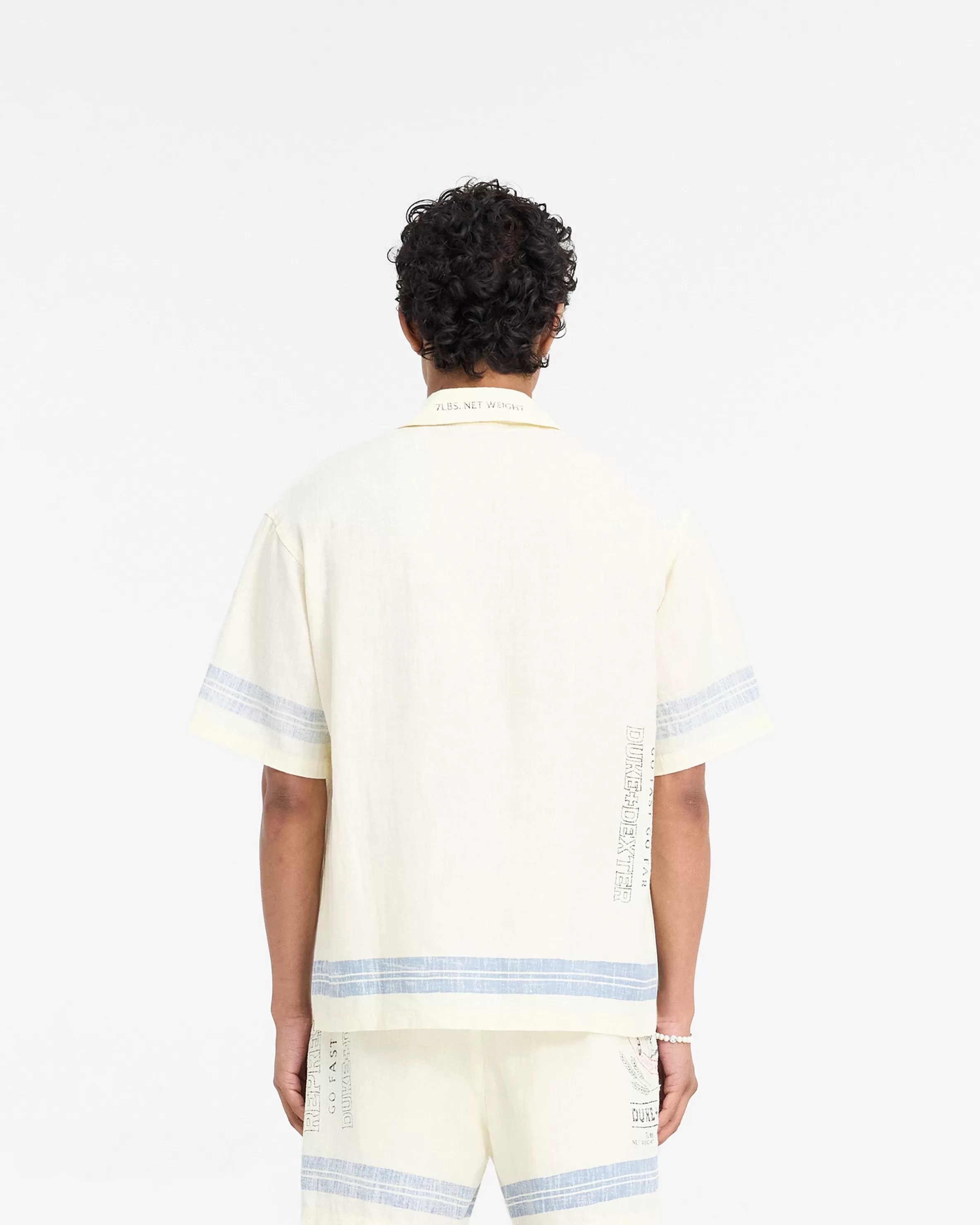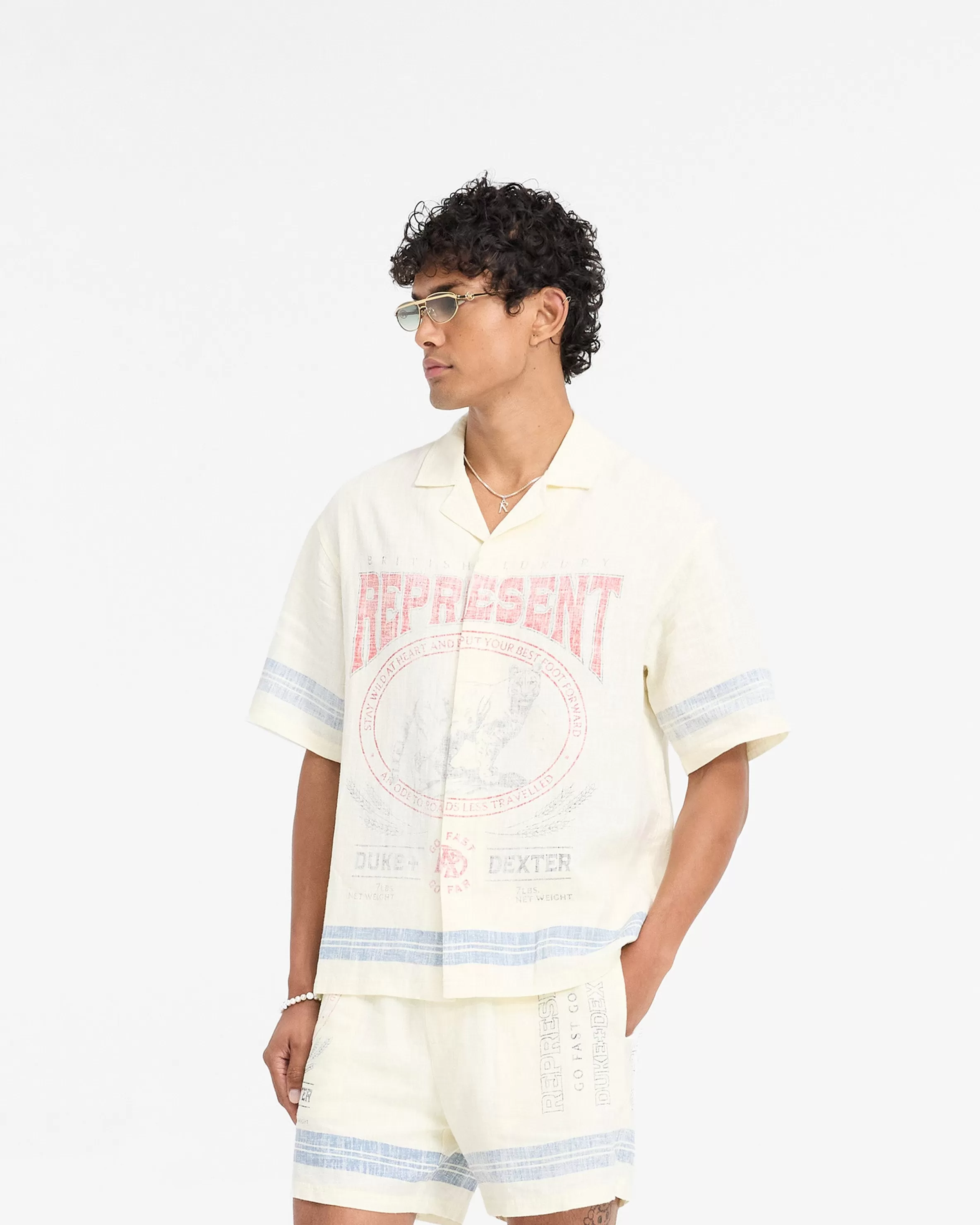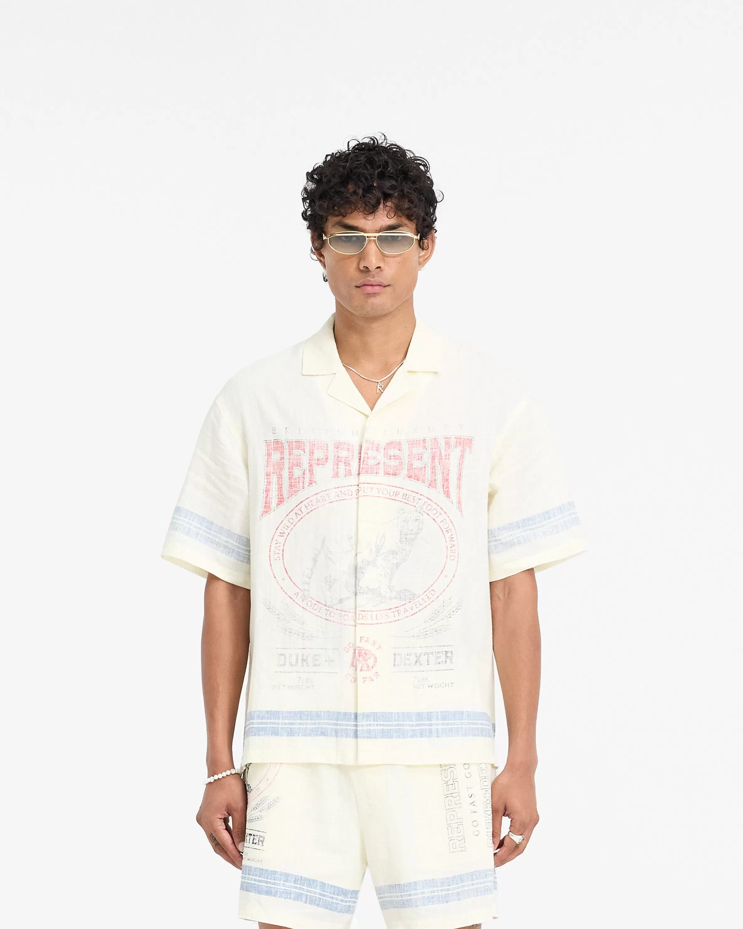 Introducing the Mountain Lion Shirt in Ecru, created in collaboration with Duke + Dexter; a revere style shirt, crafted from 100% Ramie. The craftsmanship of the shirt is inspired by mothers from the ‘60s creating clothes from used flour bags, with a faded artwork style achieved by printing to the inside of the fabric. A light enzyme wash further elevates the authenticity of the vintage look. The shirt has co-branded collaboration artwork to the front and back, with further stripe details to the hem and sleeve. Mountain Lion Shirt Revere Style Light Ramie Fabric Enzyme Wash and Inside Branding for Vintage Aesthetic Collaboration Artwork Collaborated with Duke + Dexter Composition: 100% Ramie Product Care: 30 Degree Delicate Machine Wash. Do Not Bleach. Hang Dry. Cool Iron on Reverse. Do Not Dry Clean. Wash with similar colours. Wash dark colours separately. Wash inside out. Do not pile whilst damp. Iron on Reverse. Model is 188cm and 75kg wearing size MProduct