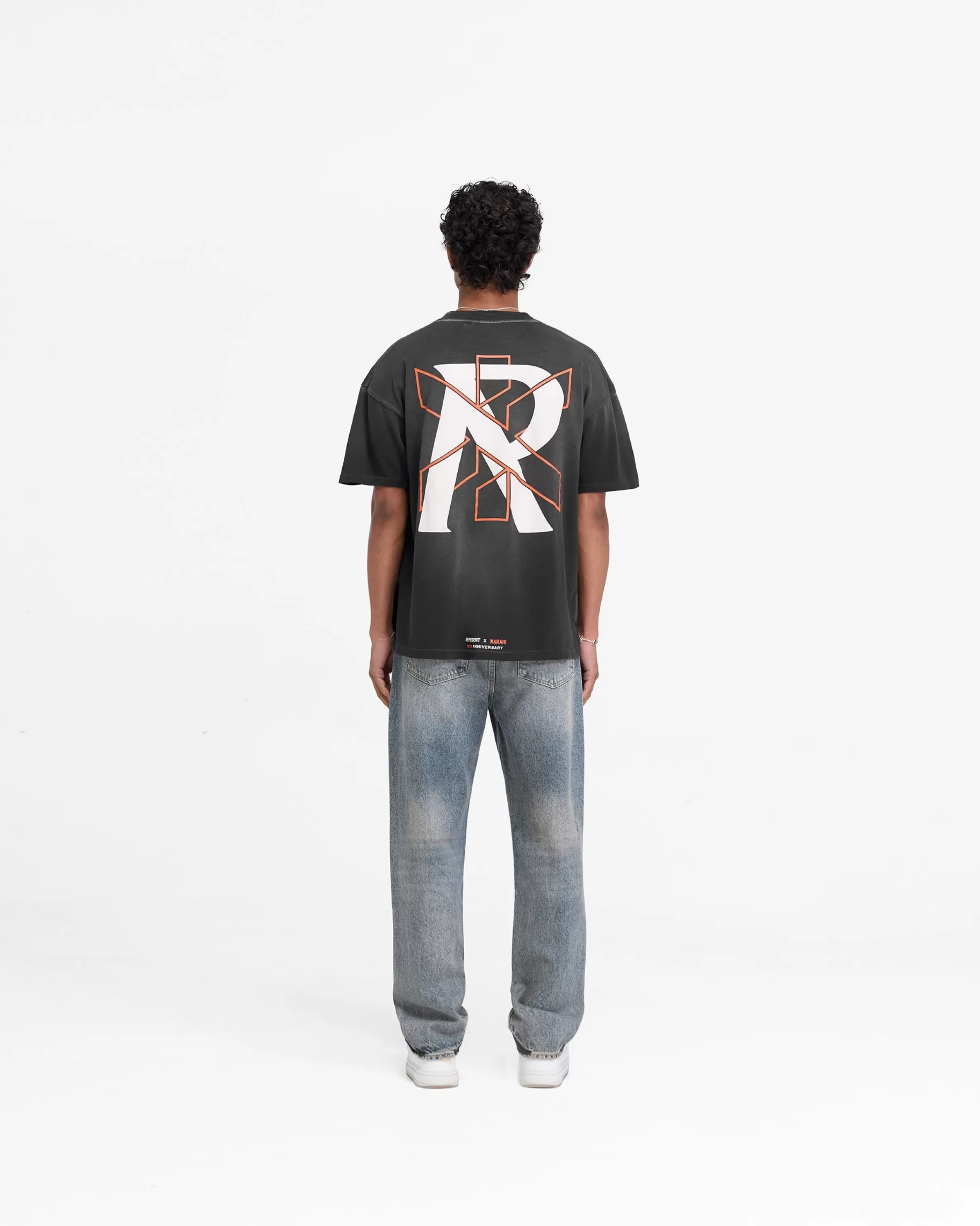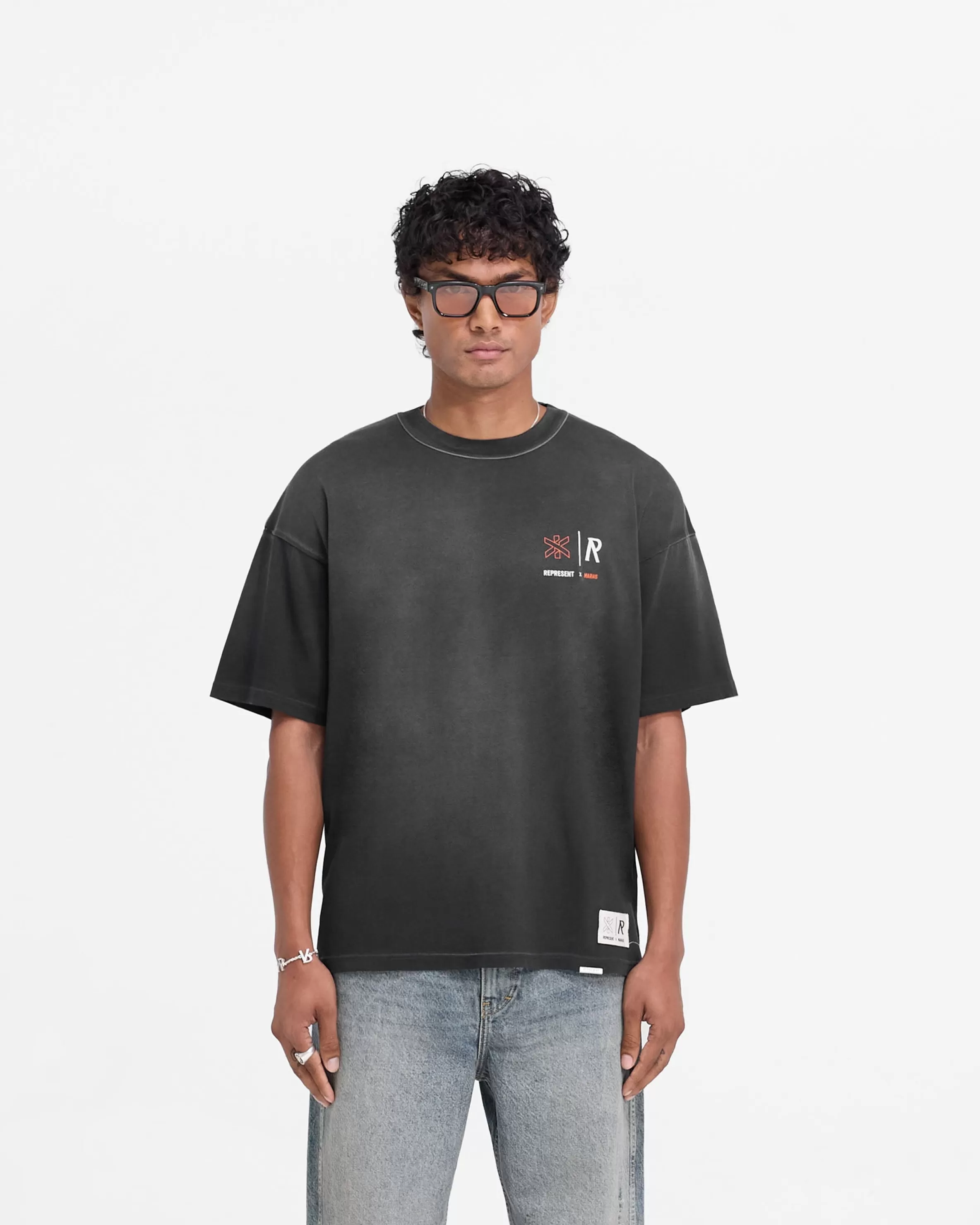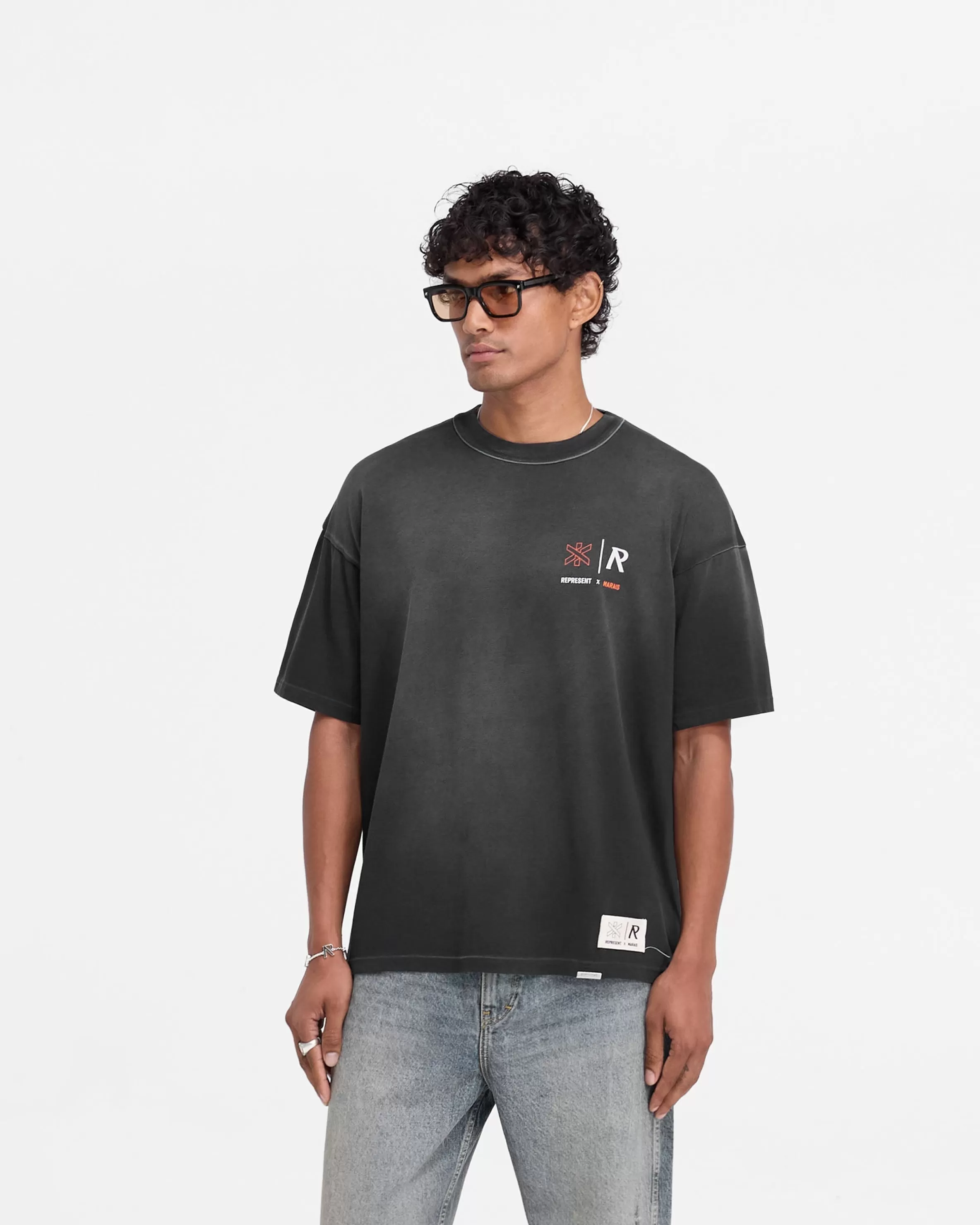 Introducing the Represent x Marais Logo Lock Up T-Shirt in aged black, a slightly oversized t-shirt crafted from medium weight jersey cotton. The t-shirt has a screen print and high density mixed graphic to the front and back, and is finished with a woven branding label to the hem. The t-shirt has a fade out wash, with spray applied for an authentically vintage hue. Aged Black T-Shirt Slightly Oversized Screen Print u0026amp; High Density Print Graphic Woven Tab Branding Fade Out Wash Composition: 100% Cotton Product