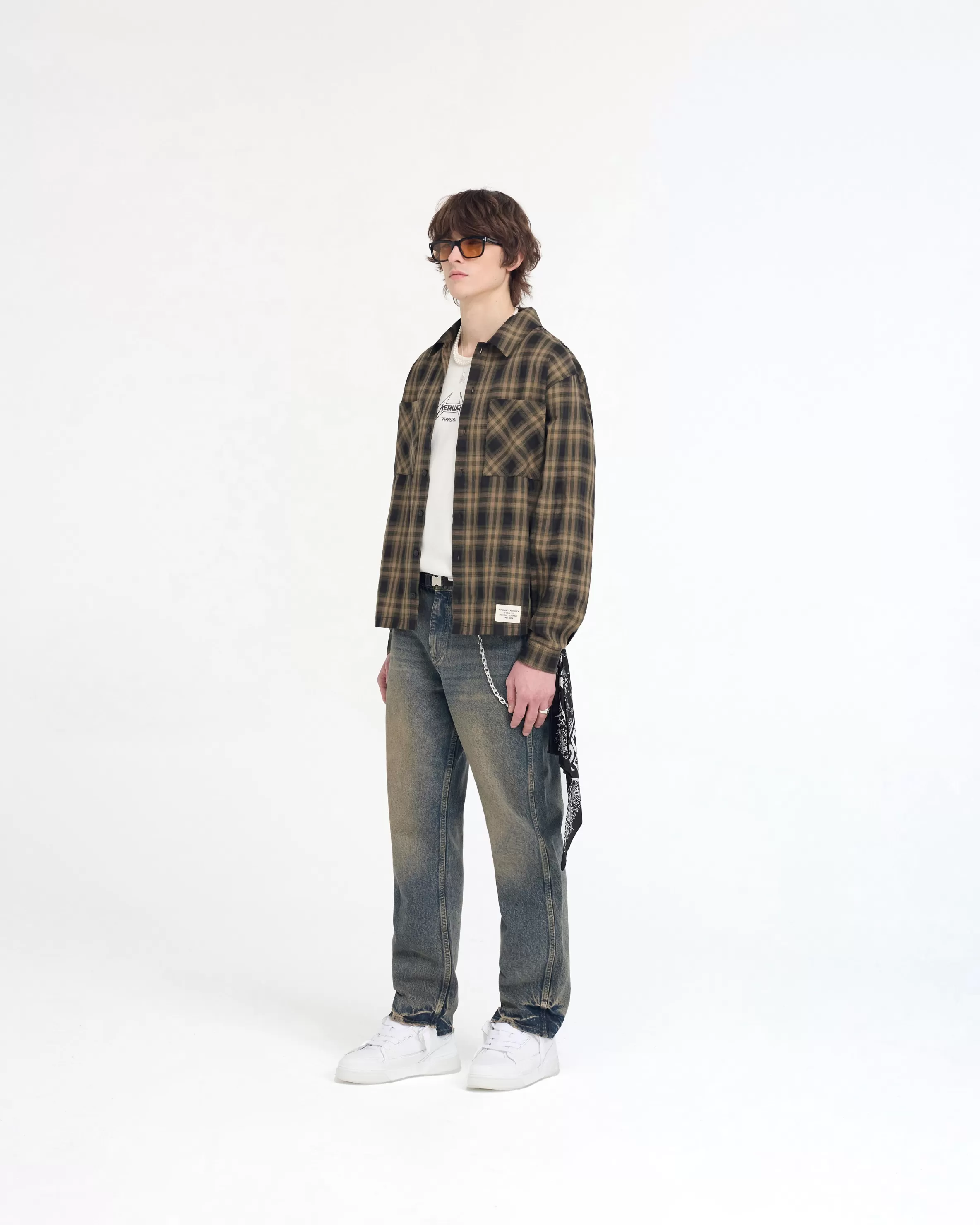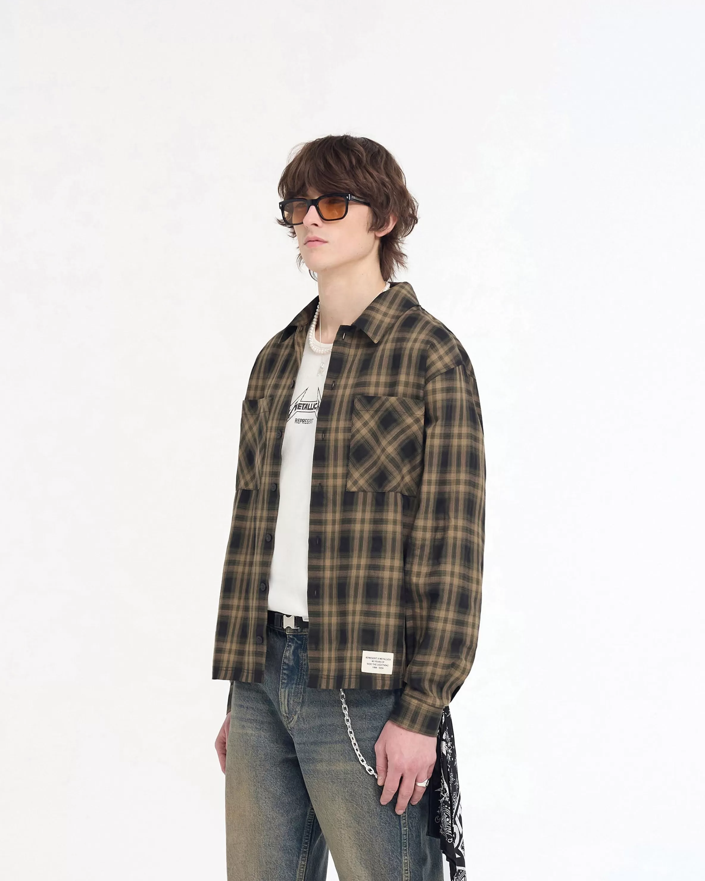 Introducing the Metallica Flannel Shirt in Tobacco. With a brown check pattern, this shirt has two chest pockets to the front, with plackets to each sleeve cuff and button fastenings. The shirt has a cracked Metallica logo print to the back and stylised Represent logo to the right sleeve. The shirt is finished with our 40 Year Anniversary patch to the front. Tobacco Metallica Flannel Shirt Slightly Oversized Fit Chest Pockets Cracked Metallica u0026amp; Stylised Represent Logos 40 Year Anniversary Patch Composition: 59% Cotton, 41% Lyocell Note: Loss of cracked print may occur with wash and wear. Care: Wash inside out at 30 degrees celsius. Hang dry only. Model is 181cm and 70kg wearing size MediumProduct